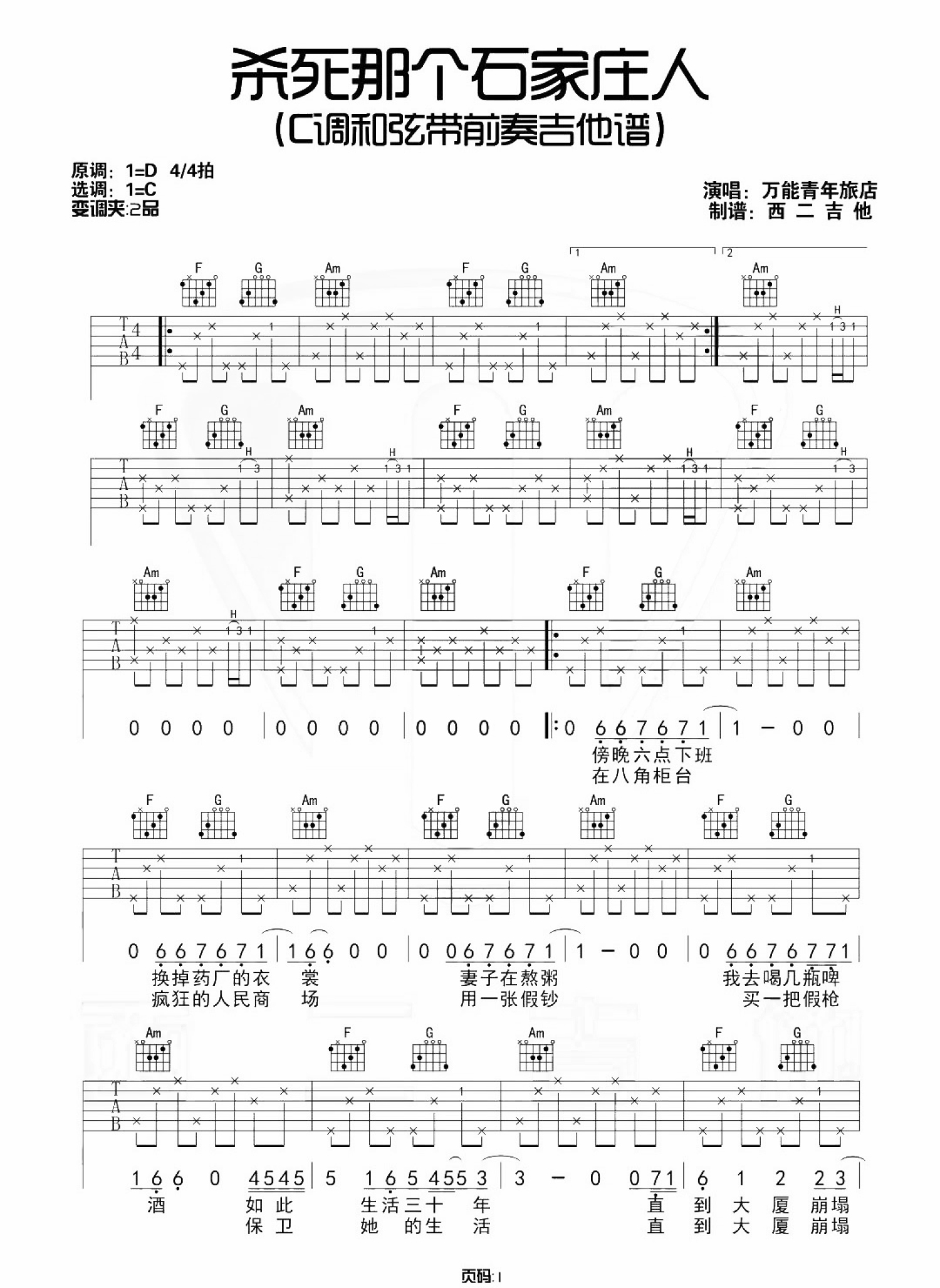 曲谱介绍: 《杀死那个石家庄人》吉他谱_万能青年旅店_C调简单版弹唱谱
