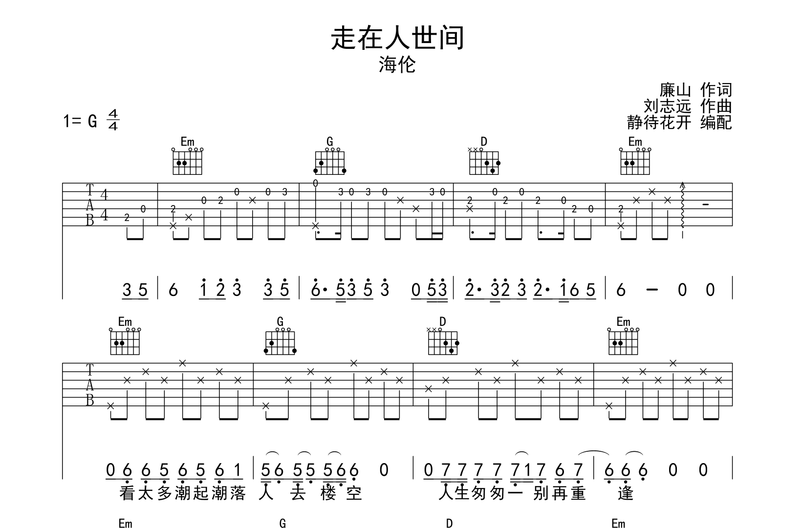 曲谱介绍: 走在人世间吉他谱,海伦演唱的一首歌曲,《走在人世间》吉他弹唱谱,本吉他谱采用G调指法编配,来自@静待花开编配制作,演奏不夹变调夹,原调G调,也可以根据个人嗓音条件灵活选择变调夹,演奏的速度控制在每分钟85拍左右,演奏难度简单。