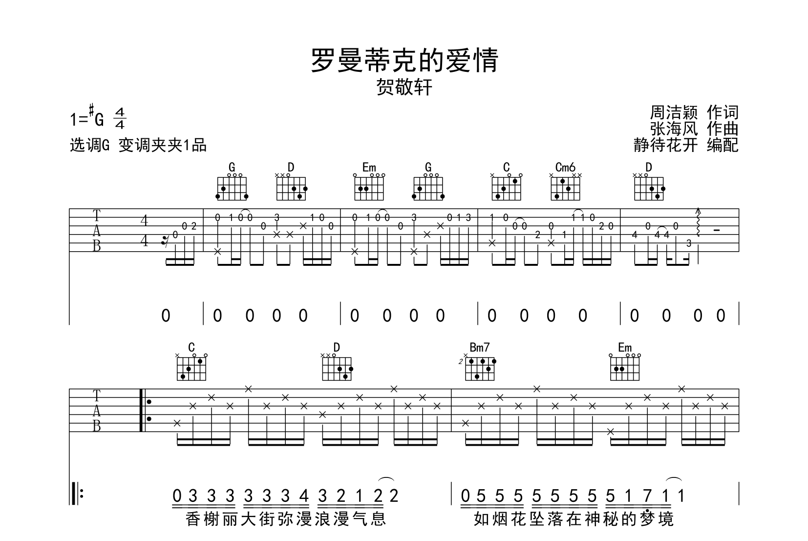 曲谱介绍: 罗曼蒂克的爱情吉他谱,贺敬轩演唱的一首歌曲,本吉他谱采用G调指法编配,来自@静待花开编配制作,变调夹夹第1品演奏,原调#G调,也可以根据个人嗓音条件灵活选择变调夹,演奏的速度控制在每分钟90拍左右,演奏难度简单,共3张高清图片谱例。