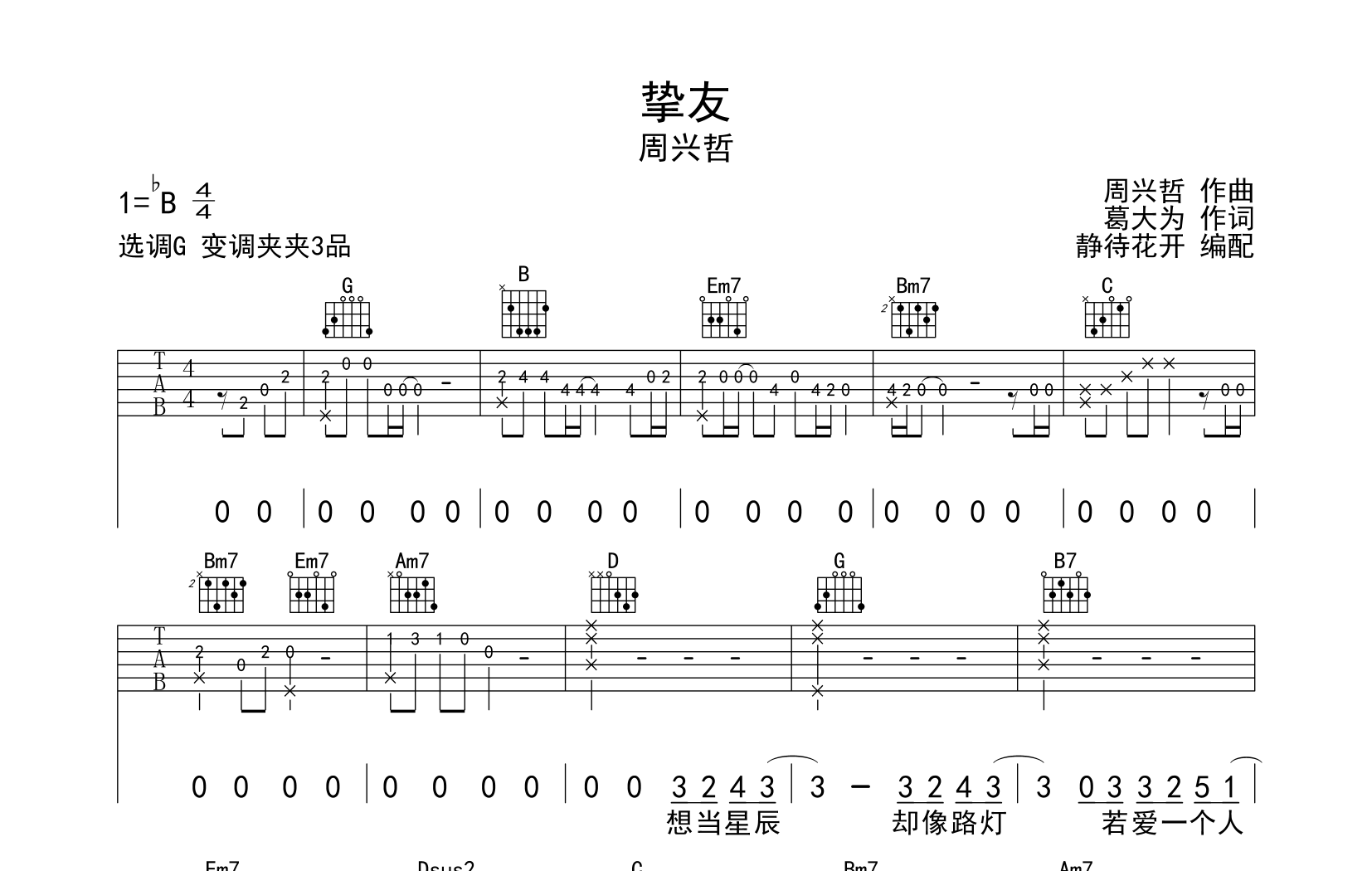 曲谱介绍: 挚友吉他谱_G调原版六线谱_周兴哲分享,本吉他谱采用G调和弦指法编配,推荐变调夹夹第3品演奏,原调bB调,也可以根据个人嗓音条件灵活选择变调夹位置,演奏的速度控制在每分钟75拍左右,演奏难度简单。
