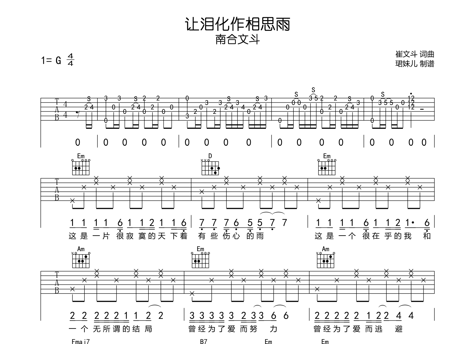 曲谱介绍: 让泪化作相思雨吉他谱,南合文斗演唱的一首经典歌曲,本谱采用G调指法编配,速度85BPM,难度较简单,易上手,节奏4/4拍,共2张高清图片谱,由珺妹儿制谱分享。