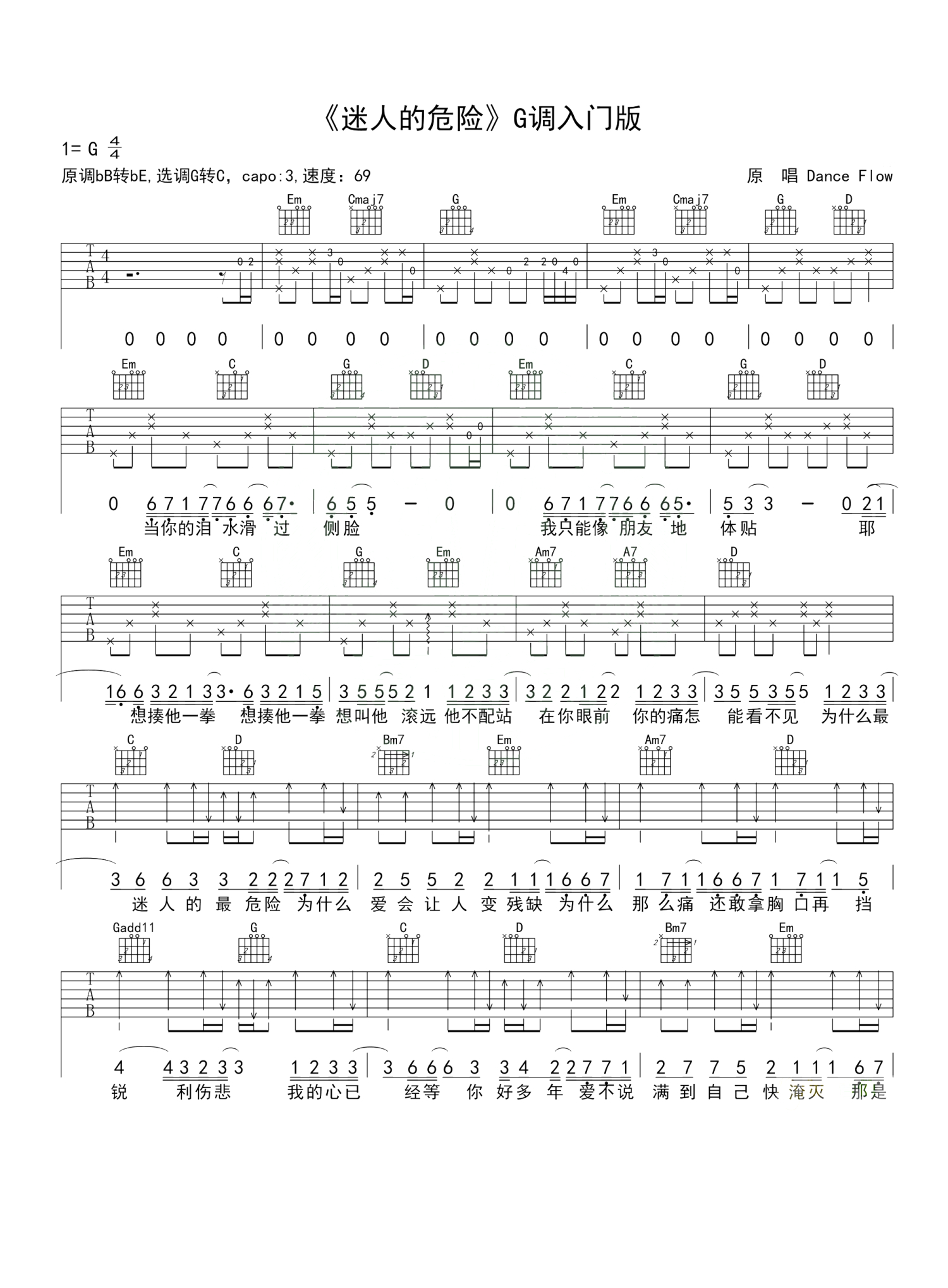 迷人的危险吉他谱 - Dance Flow - G调吉他弹唱谱