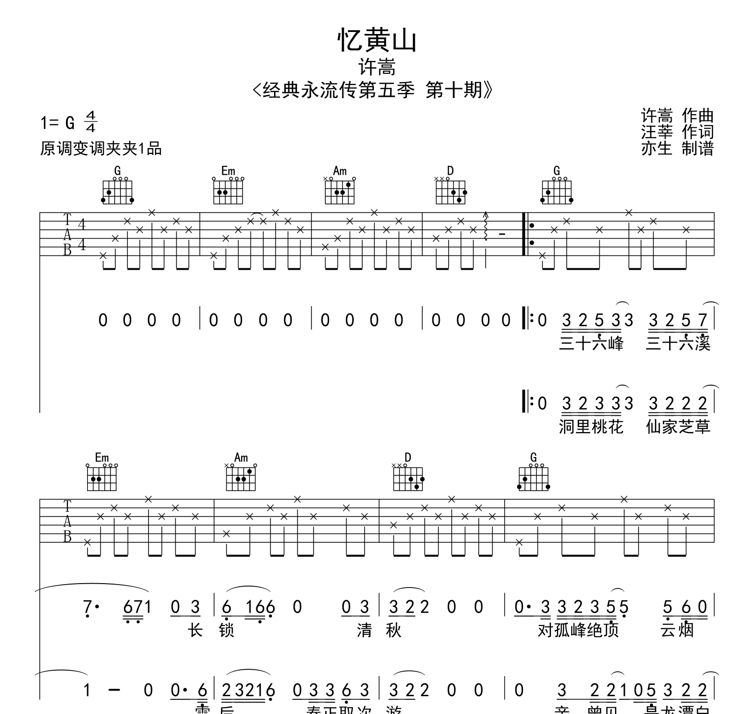 忆黄山吉他谱 - 许嵩 - G调吉他弹唱谱