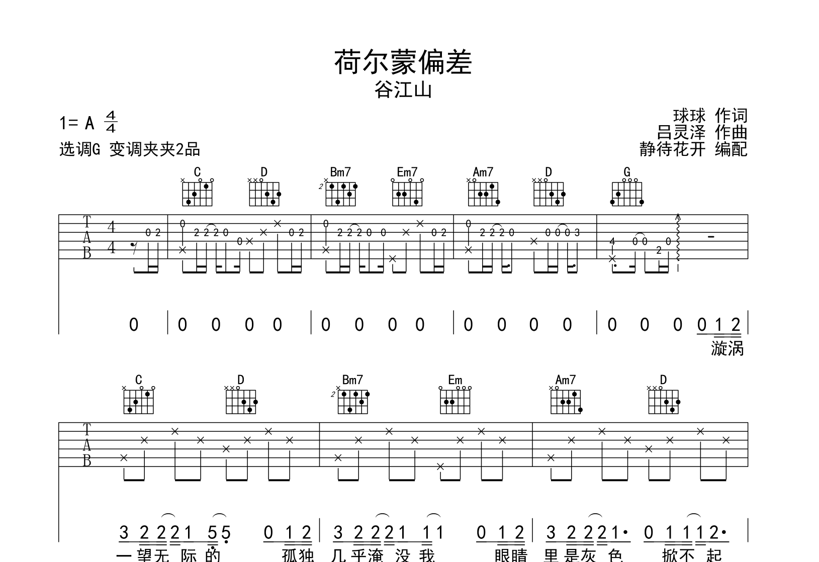 曲谱介绍: 荷尔蒙偏差吉他谱,谷江山演唱的一首歌曲,本吉他谱采用G调和弦指法编配,推荐变调夹夹第2品演奏,原调A调,也可以根据个人嗓音条件灵活选择变调夹位置,演奏的速度控制在每分钟85拍左右,演奏难度简单。