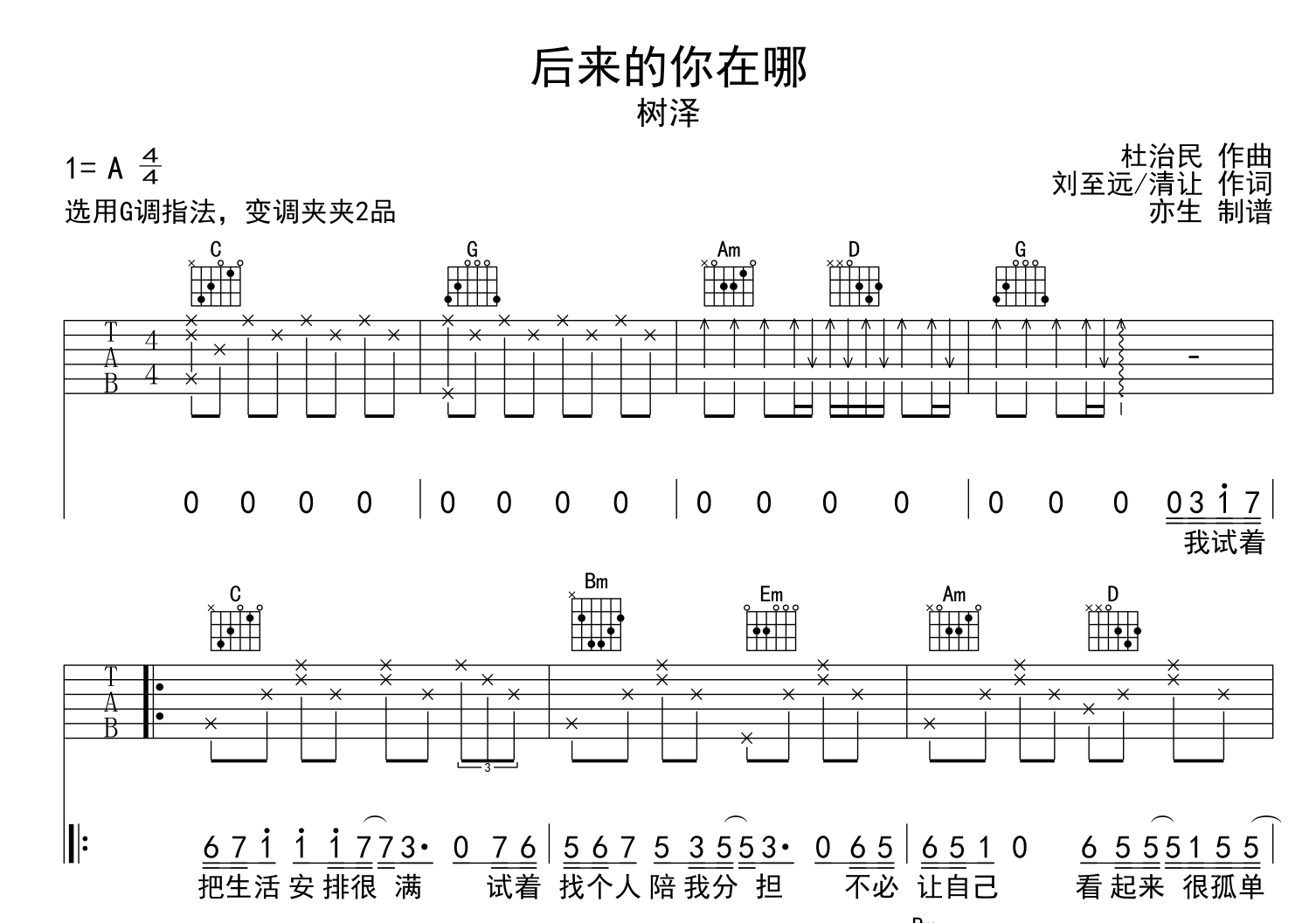 后来的你在哪吉他谱 - 树泽 - G调吉他弹唱谱