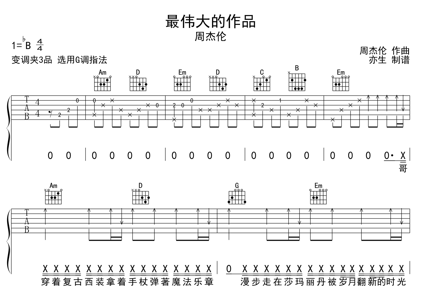 曲谱介绍: 最伟大的作品吉他谱,周杰伦最新单曲,《最伟大的作品》吉他弹唱谱,本吉他谱采用G调和弦指法编配,推荐变调夹夹第3品演奏,节奏4/4拍,演奏的速度控制在每分钟100拍左右,演奏难度简单,本谱由亦生制谱,共5张高清图片谱例。 最伟大的作品吉他谱_G调原版弹唱谱_高清图片谱_周杰伦分享,全新杰伦单曲来临,赶紧练习起来吧!