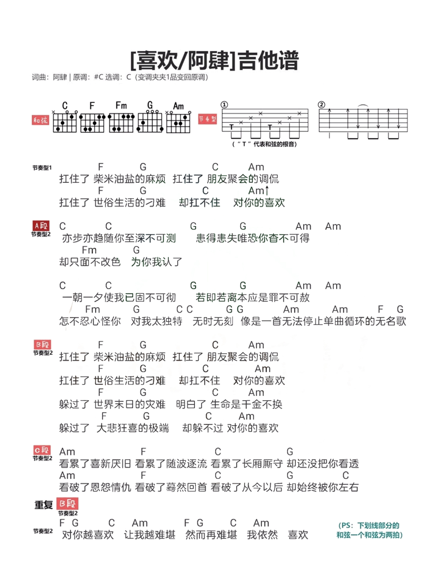 曲谱介绍: 《喜欢》吉他谱,阿肆词曲演唱,原调#C,选用C调指法,变调夹夹一品变回原调,喜欢吉他弹唱谱,和弦与节奏型参照图片谱标注。