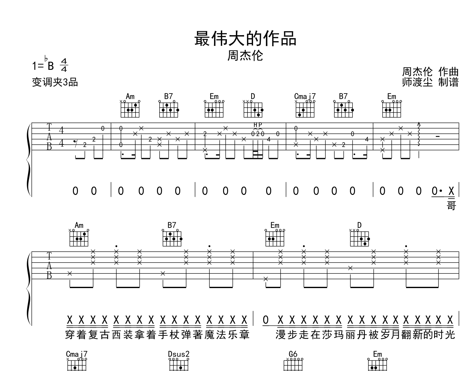 曲谱介绍: 最伟大的作品吉他谱,周杰伦演唱。来自@师渡尘编配扒谱制作,本吉他谱采用G调和弦指法编配,推荐变调夹夹第3品演奏,原调*调,也可以根据个人嗓音条件灵活选择变调夹位置,演奏的速度控制在每分钟76拍左右,演奏难度简单。