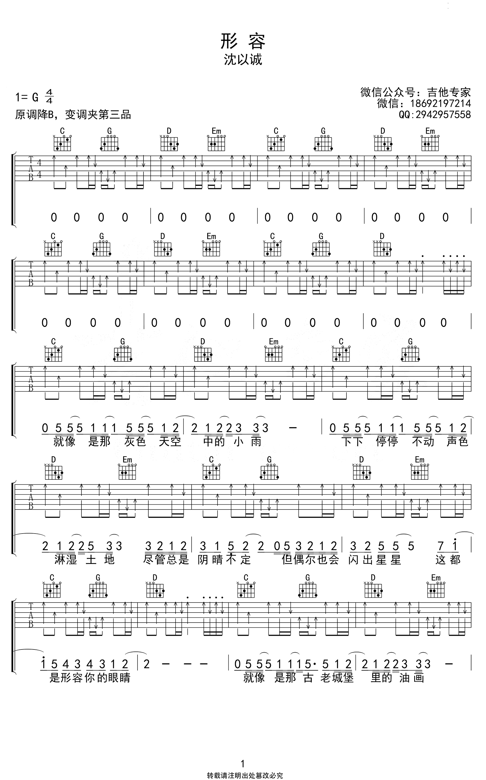 曲谱介绍: 形容吉他谱,沈以诚的一首代表歌曲,《形容》吉他弹唱谱,原调降B,变调夹夹三品,选用G调指法编配,完整高清六线谱共四张图片谱例。 一首让你少女心泛滥的歌曲,超级治愈系嗓音,超好听。