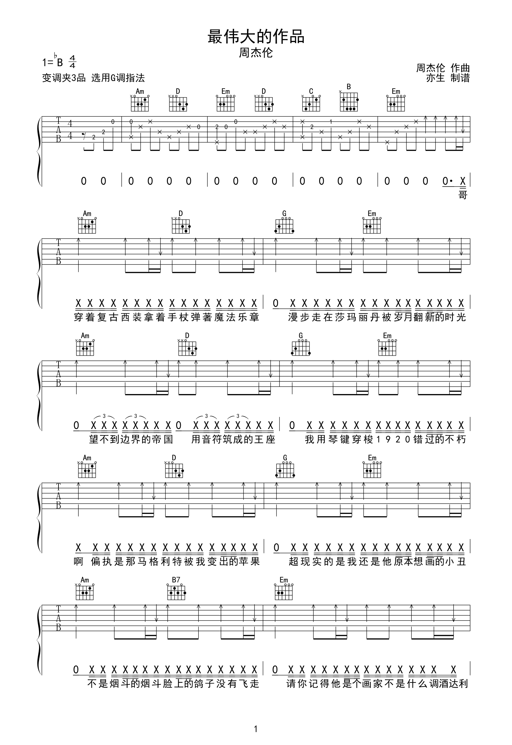 曲谱介绍: 最伟大的作品吉他谱,周杰伦演唱,《最伟大的作品》吉他弹唱谱采用G调和弦指法编配,推荐变调夹夹第3品演奏,节奏4/4拍,演奏的速度控制在每分钟100拍左右,演奏难度简单。 还是熟悉的味道,还是熟悉的配方,只要一听音乐节奏响起,就知道是周董没错了~他依旧是我们青春记忆中那个说着“请大家支持华人的音乐…华人音乐才是最 diao 的”的少年。