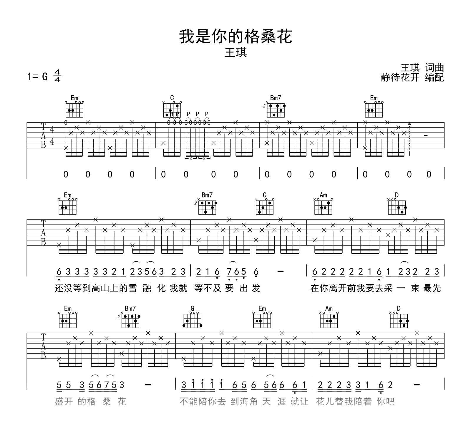 曲谱介绍: 我是你的格桑花吉他谱,王琪演唱,一首凄美动听的网络伤感情歌,《我是你的格桑花》吉他弹唱谱,选用原调G调和弦指法编配,不夹变调夹,速度在每分钟70拍左右,演奏难度简单。