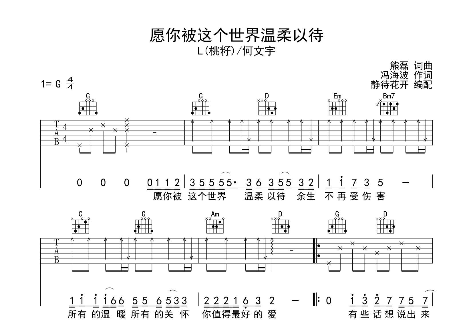 曲谱介绍: 愿你被这个世界温柔以待吉他谱,来自@静待花开编配扒谱制作,本吉他谱采用G调和弦指法编配,演奏不夹变调夹,原调G调,也可以根据个人嗓音条件灵活选择变调夹位置,演奏的速度控制在每分钟70拍左右,演奏难度简单。