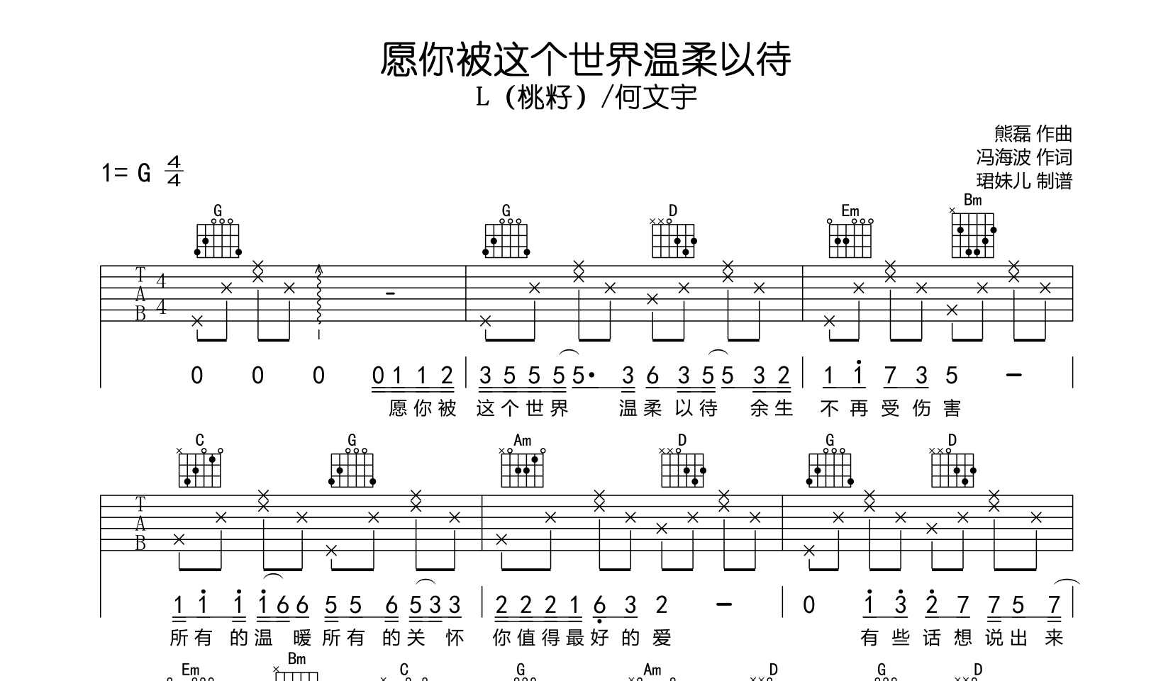 曲谱介绍: 愿你被这个世界温柔以待吉他谱,L(桃籽)/何文宇演唱的一首网络歌曲,本谱采用G调指法编配,速度75BPM,难度较简单,易上手,本谱共3张高清图片谱例,由珺妹儿制谱分享。