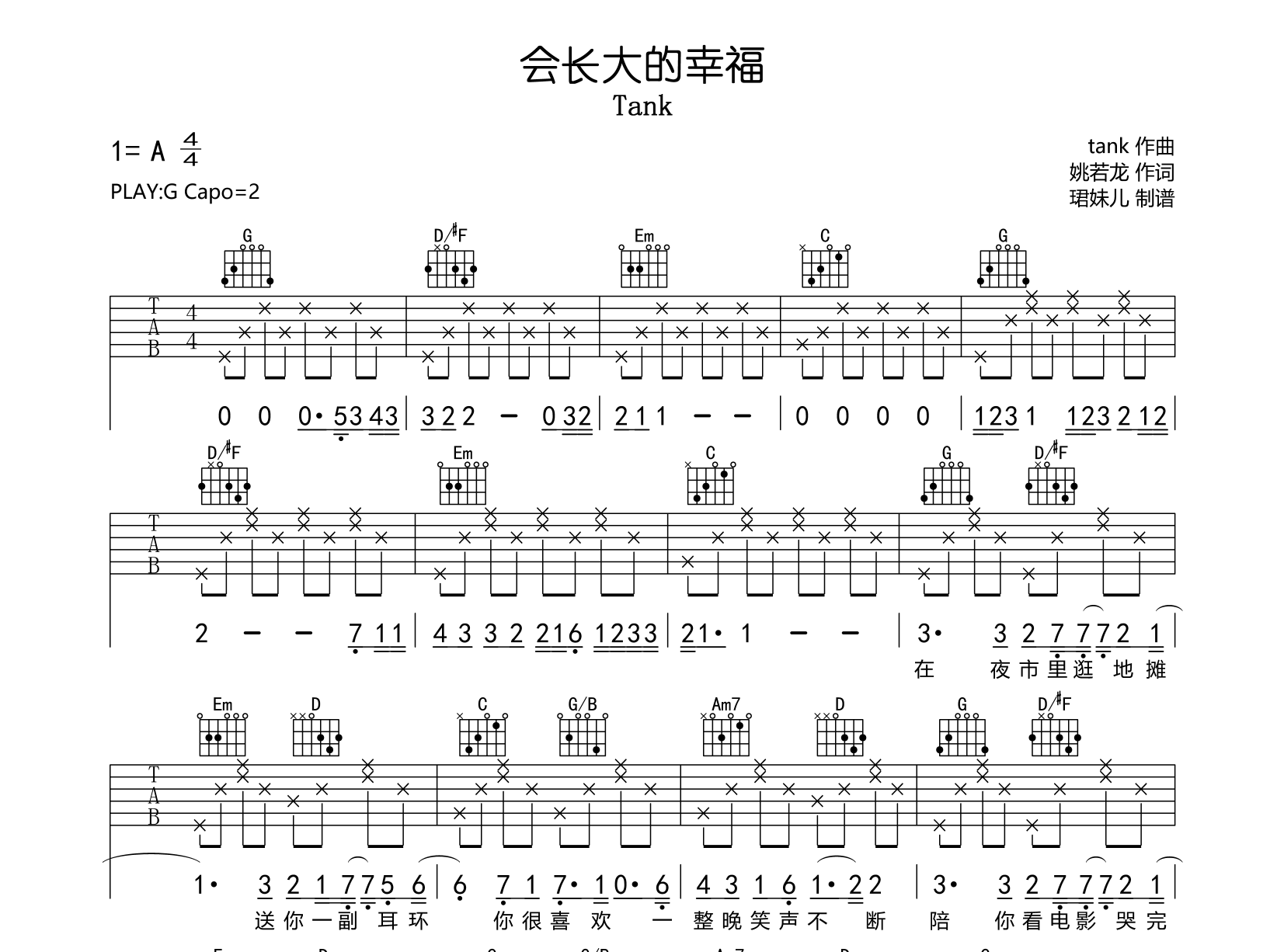 曲谱介绍: 会长大的幸福吉他谱,TANK演唱,《会长大的幸福》吉他弹唱谱,本谱采用G调指法编配,弹唱建议变调夹2品,速度85BPM,难度较简单,易上手,由珺妹儿制谱,共3张高清图片谱例。