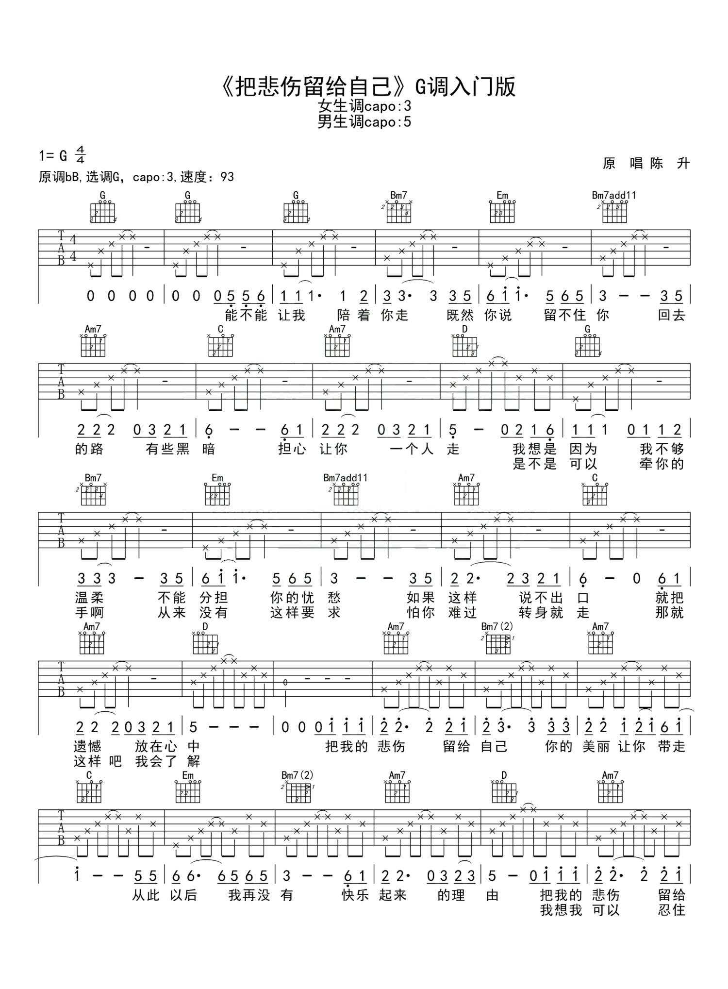 把悲伤留给自己吉他谱 - 陈升 - G调吉他弹唱谱