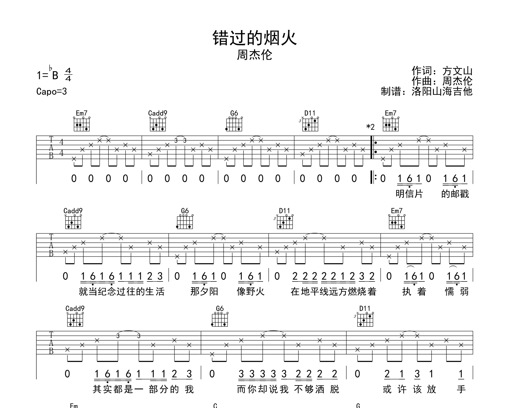 曲谱介绍: 《错过的烟火》吉他谱,周杰伦演唱,《错过的烟火》吉他弹唱谱,选用G调指法,原调bB,节奏4/4拍,由洛阳山海吉他制谱分享,共有2张高清图片谱例。 《错过的烟火》是周杰伦演唱的一首歌曲,收录于专辑《最伟大的作品》中。