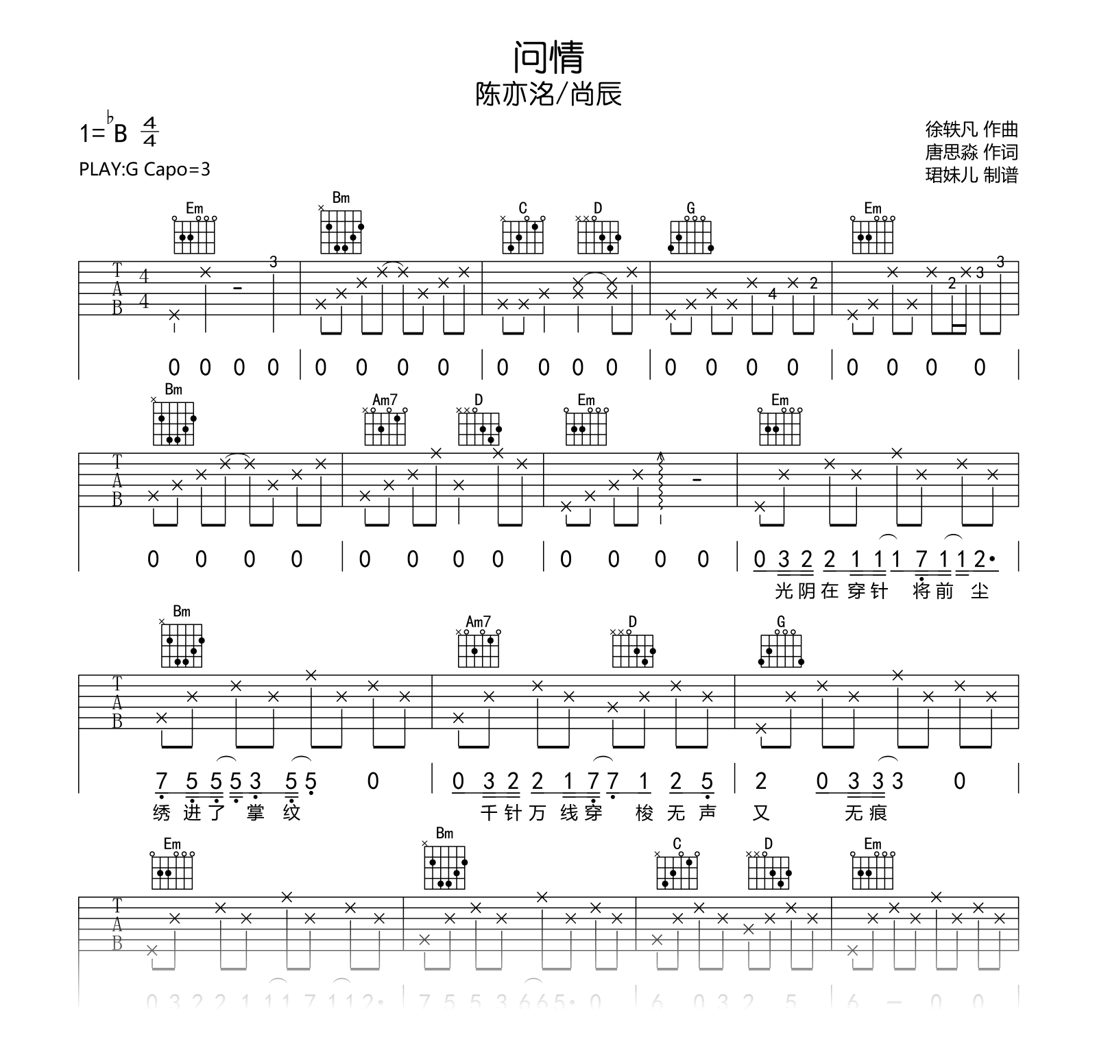 曲谱介绍: 问情吉他谱,陈亦洺/尚辰演唱,《问情》吉他弹唱谱,原调bB,采用G调指法编配,Capo夹3品,演奏速度85BPM,六线谱较简单,易上手。