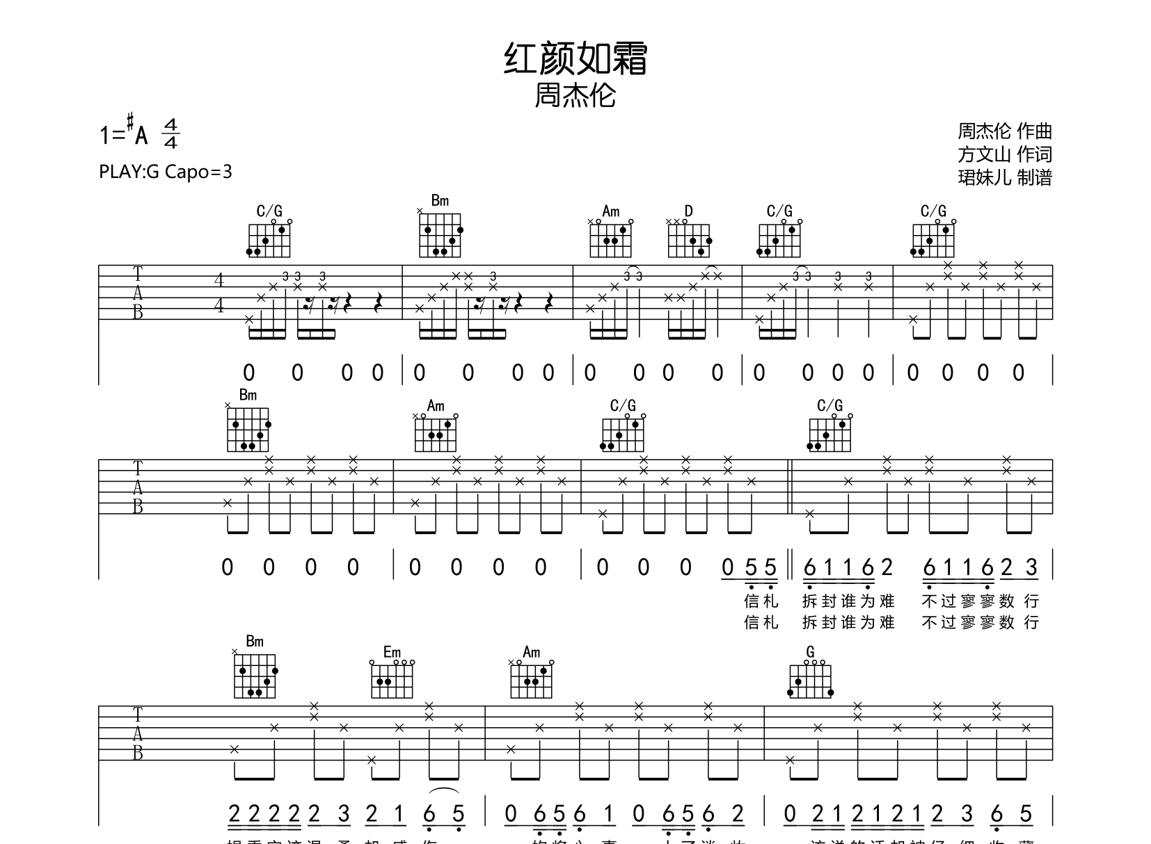 曲谱介绍: 红颜如霜吉他谱,周杰伦演唱,《红颜如霜》吉他弹唱谱,本谱采用G调指法编配,弹唱建议变调夹3品,速度95BPM,节奏4/4拍,难度较简单,易上手,共三张图片谱例,由珺妹儿制谱分享。
