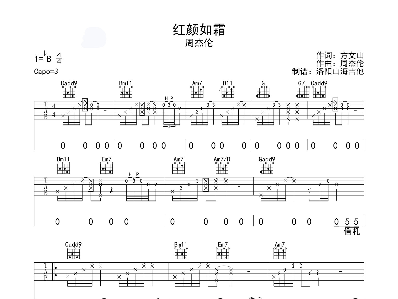 曲谱介绍: 《红颜如霜》吉他谱,周杰伦2022新专辑的歌曲,《红颜如霜》吉他弹唱谱,选用G调指法,原调bB,节奏4/4拍,由洛阳山海吉他制谱分享,难度适中,还原度较高,共有3张高清图片谱。