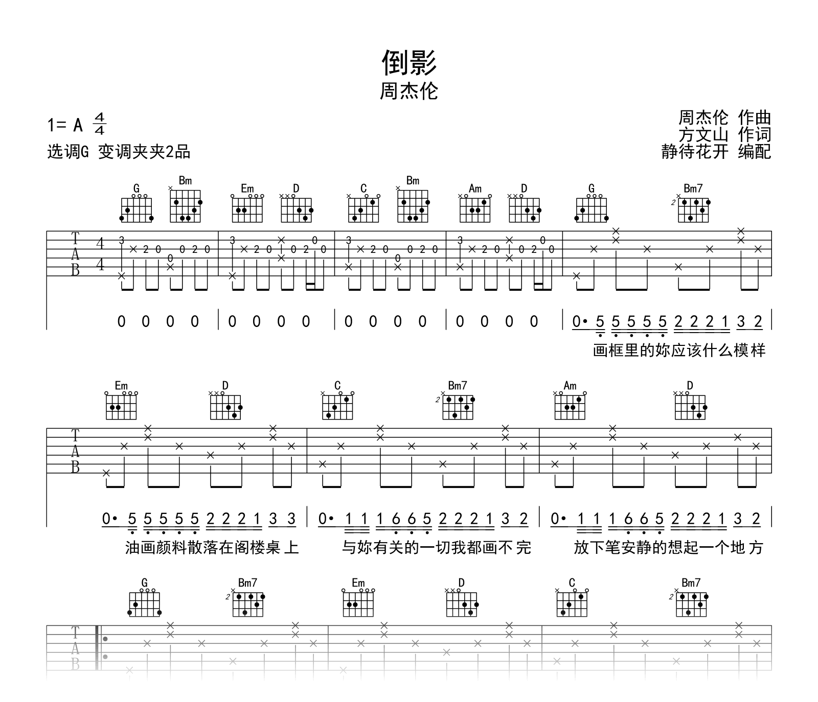 曲谱介绍: 倒影吉他谱,周杰伦演唱,《倒影》吉他弹唱六线谱,原调A,采用G调和弦指法编配,变调夹夹第二品,也可依自己音域灵活选择变调夹位置,速度在每分钟85拍左右,演奏难度简单。