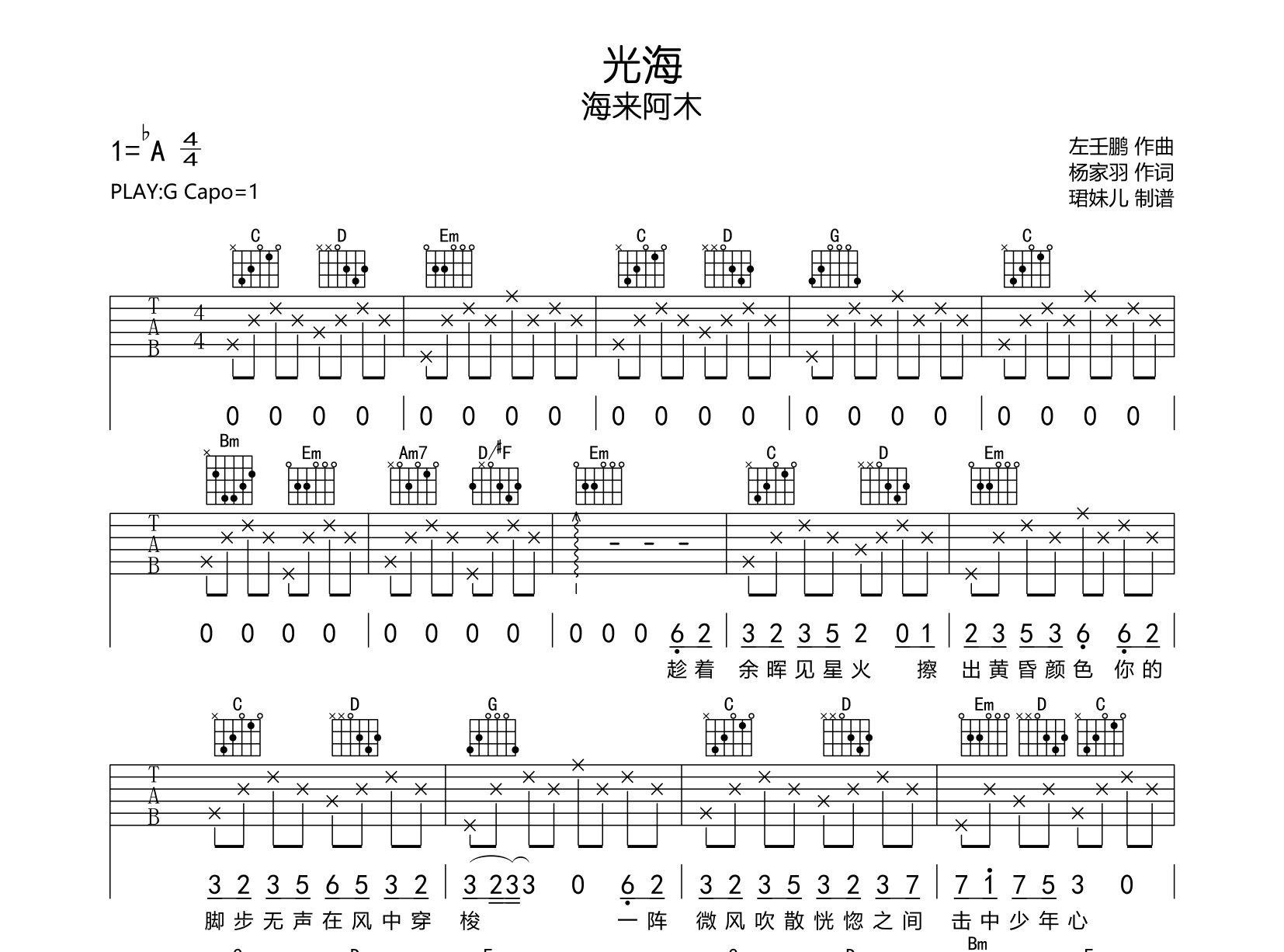 曲谱介绍: 光海吉他谱,海来阿木演唱的一首歌曲,《光海》吉他弹唱谱,本谱采用G调指法编配,弹唱建议变调夹1品,速度85BPM,节奏4/4拍,难度较简单,易上手,共2张高清六线谱图例,由珺妹儿制谱分享。