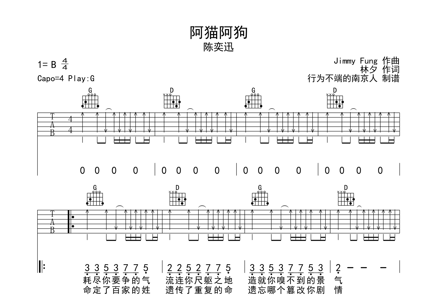 曲谱介绍: 阿猫阿狗吉他谱,陈奕迅演唱的一首歌曲,阿猫阿狗吉他六线谱,由行为不端南京人编配制谱上传,4/4拍的节奏,难度为低级。歌曲原调为B调,这里曲谱采用G调指法进行编配,演唱时夹变调夹4品可回到原调,也可根据个人嗓音情况选择,演奏速度建议保持100bmp,也可自由发挥。