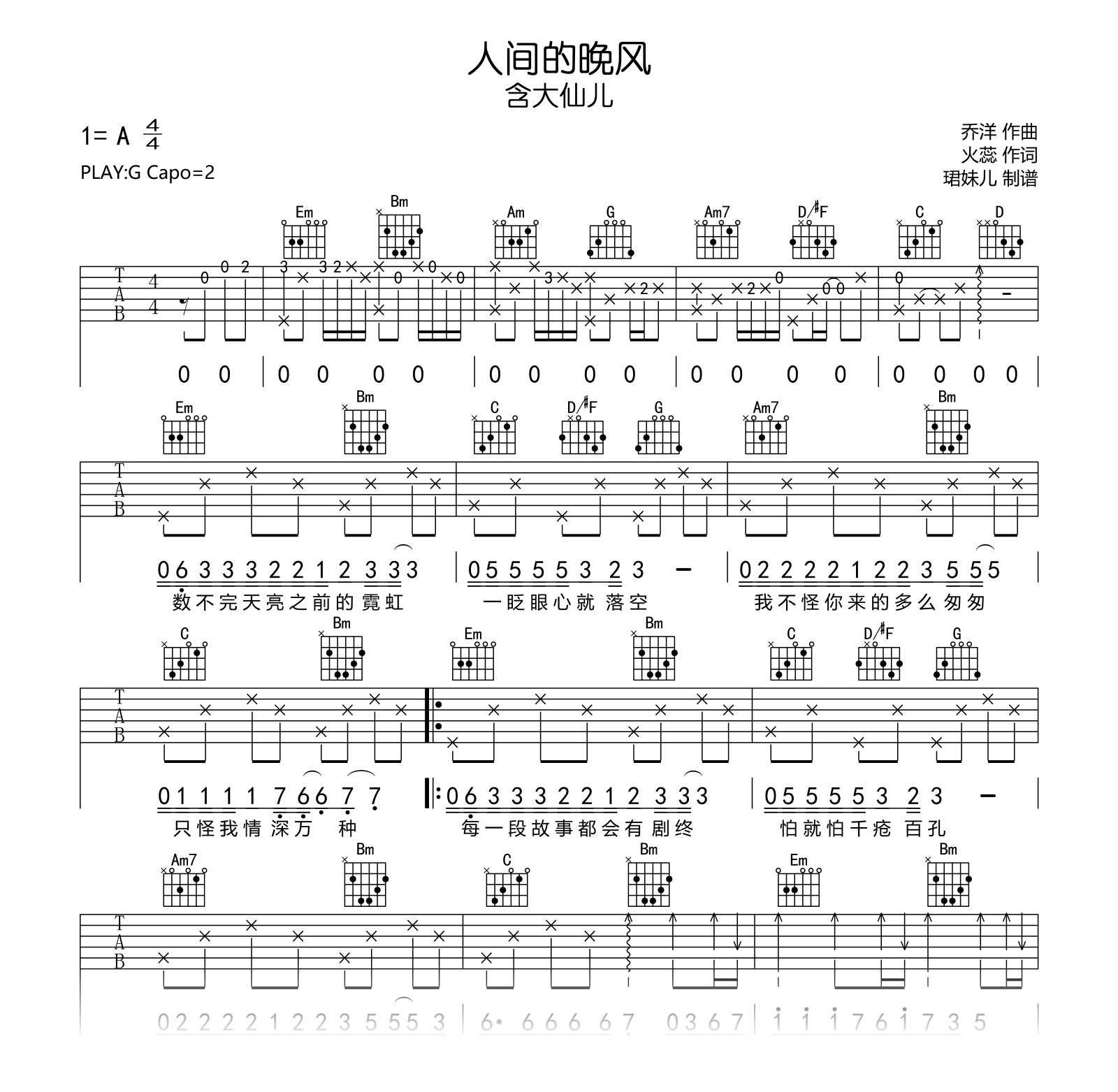 人间的晚风吉他谱 - 含大仙儿 - G调吉他弹唱谱