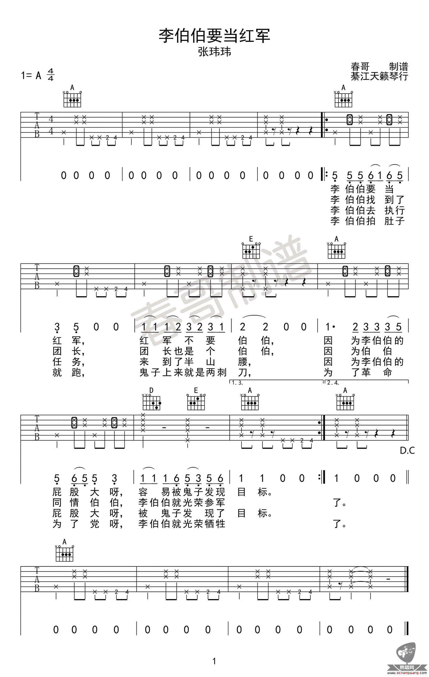 李伯伯要当红军吉他谱 - 张玮玮 - A调吉他弹唱谱