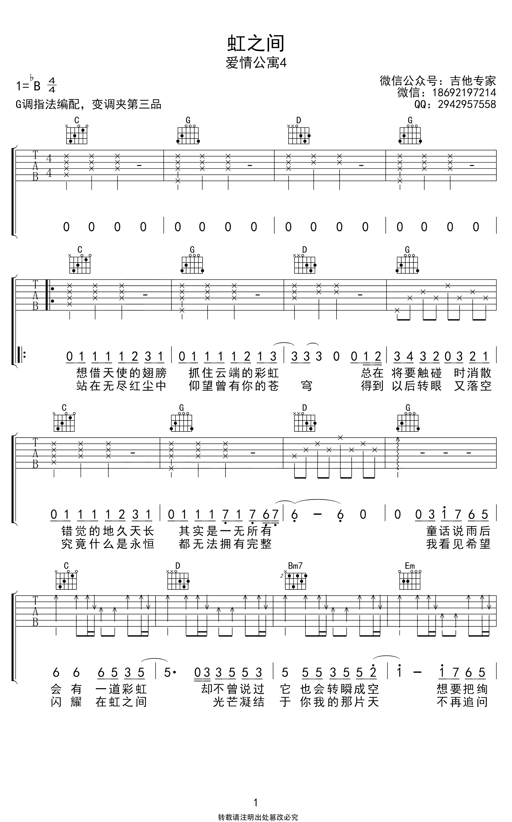 曲谱介绍: 虹之间吉他谱,金贵晟献唱《爱情公寓》电视剧插曲,《虹之间》吉他弹唱谱,原调降B,选用G调指法编配,变调夹夹三品,高清六线谱共三张图片谱例。
