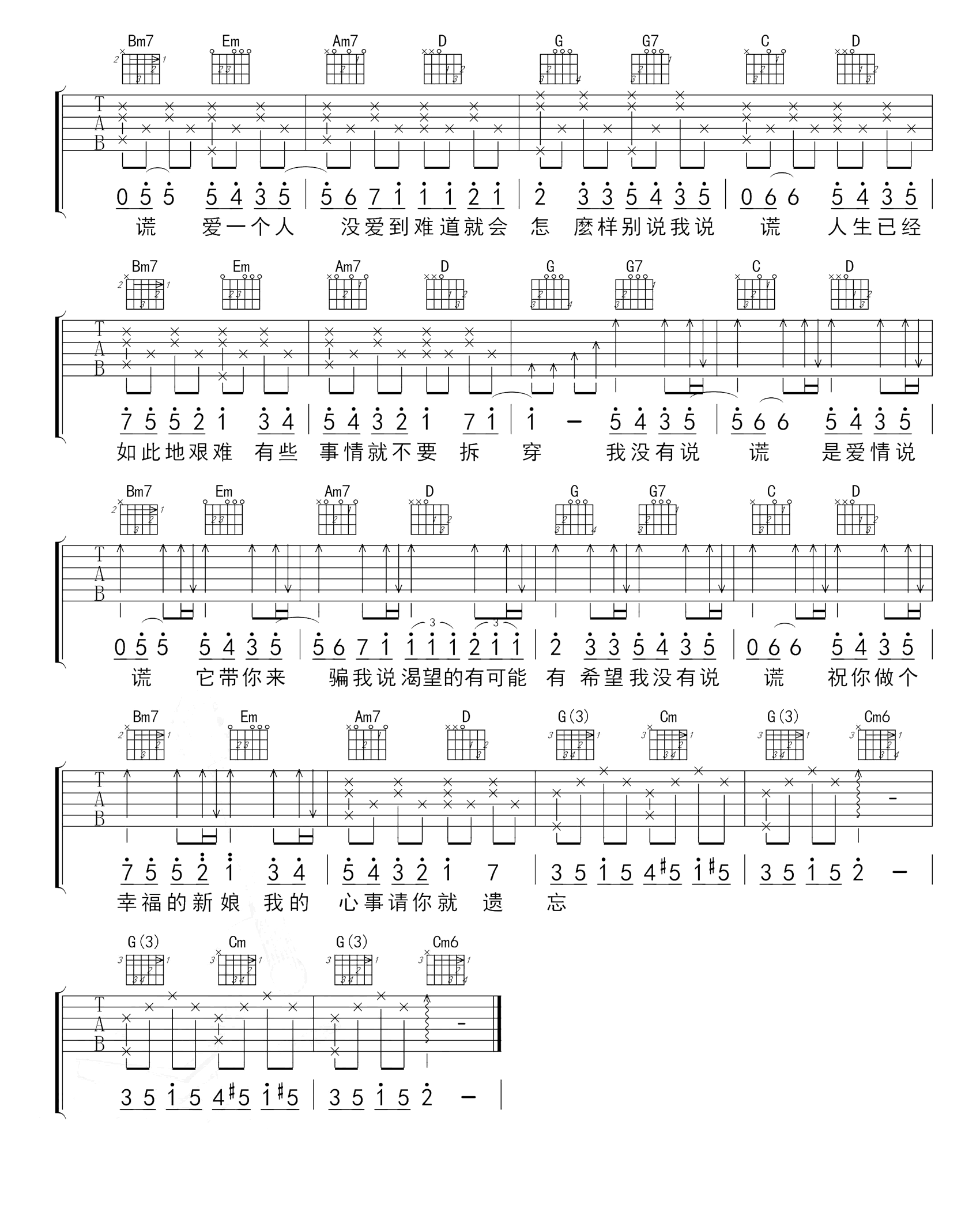 曲谱介绍: 说谎吉他谱,林宥嘉演唱的一首经典疗伤必备情歌,《说谎》吉他弹唱谱,原调bB调,选调G,CAPO男生夹二品女生夹四品,共三张高清图片六线谱。