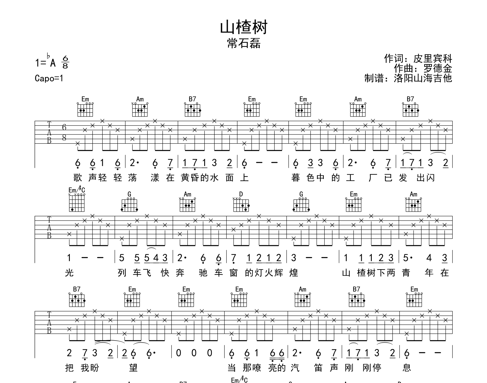 曲谱介绍: 《山楂树》吉他谱,常石磊演唱的歌曲,《山楂树》吉他弹唱谱,选用G调指法,原调bA,节奏6/8拍,共有1张高清图片谱,有洛阳山海吉他制谱分享。