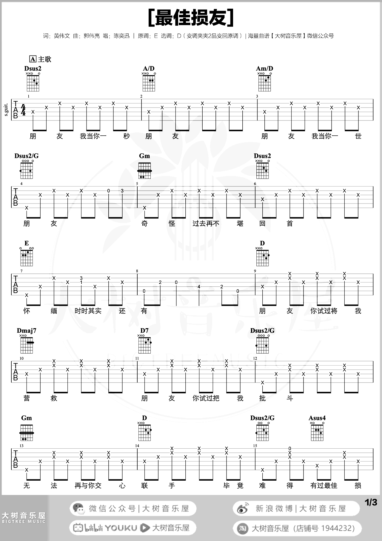 曲谱介绍: 最佳损友吉他谱,陈奕迅的一首粤语歌曲,原调E选调D,变调夹夹二品回原调,三张图片六线谱。《最佳损友》吉他弹唱演示和教学视频,整首歌没有前奏,所以相对来说演奏比较简单。同学们可以跟随老师的示范讲解练习起来。 相信每个人都经历过这种从密友变为陌生人的事情,以至于每次听到《最佳损友》这首歌,你都会想起这样一个人。