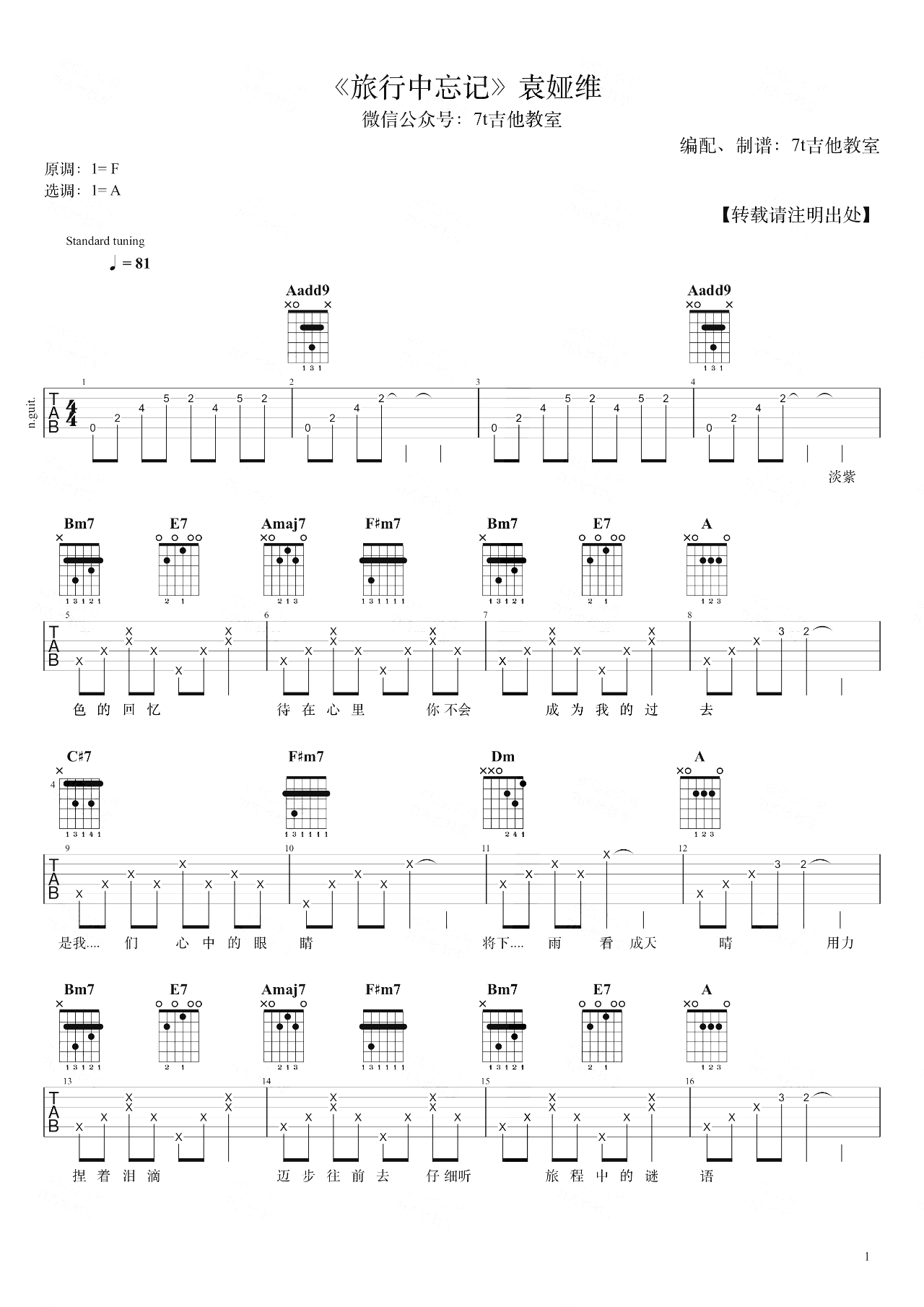 旅行中忘记吉他谱 - 袁娅维 - A调吉他弹唱谱