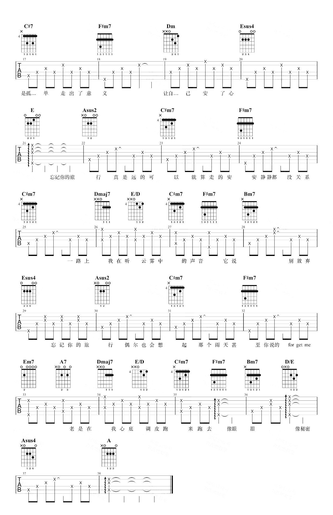 曲谱介绍: 旅行中忘记吉他谱,袁娅维演唱,这首歌的原调是F大调,用的是A大调的指法来编配,《旅行中忘记》吉他演示视频里是降半音调弦,没有使用变调夹。这个谱子不适合弹原调哦,因为要夹太多品了…… 主歌用了副属和弦 C#7 → F#m7,很常见的用法;另外还用了四级小和弦Dm,主歌前半段是小四级连接一级,后半段是小四级连接五级,都用在终止式里面,副歌用到了251离调 Em7 → A7 → Dmaj7,以四级为临时主和弦是十分常见的。