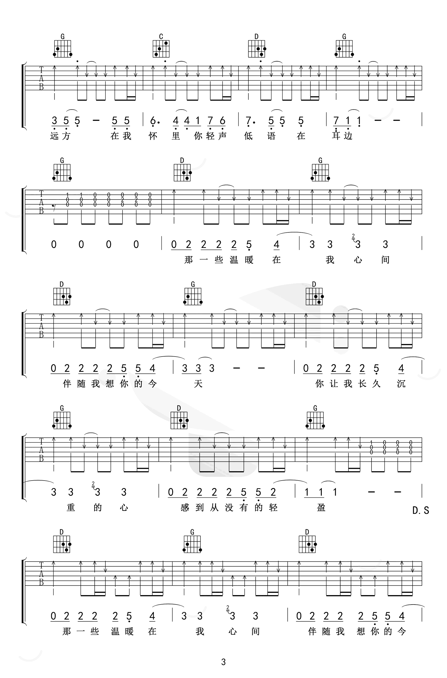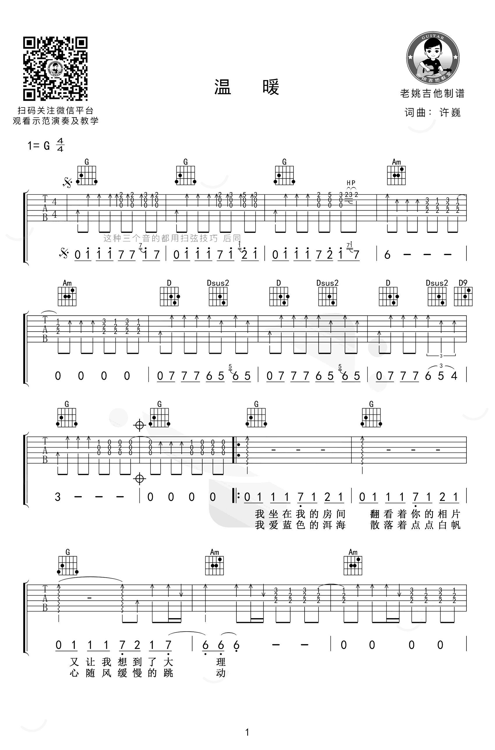 曲谱介绍: 温暖吉他谱,许巍演唱的一首经典民谣歌曲,G调和弦指法编配,完整版共四张高清图片谱。附上《温暖》吉他弹唱演示和教学视频,琴友们跟随老姚老师的示范讲解练习。