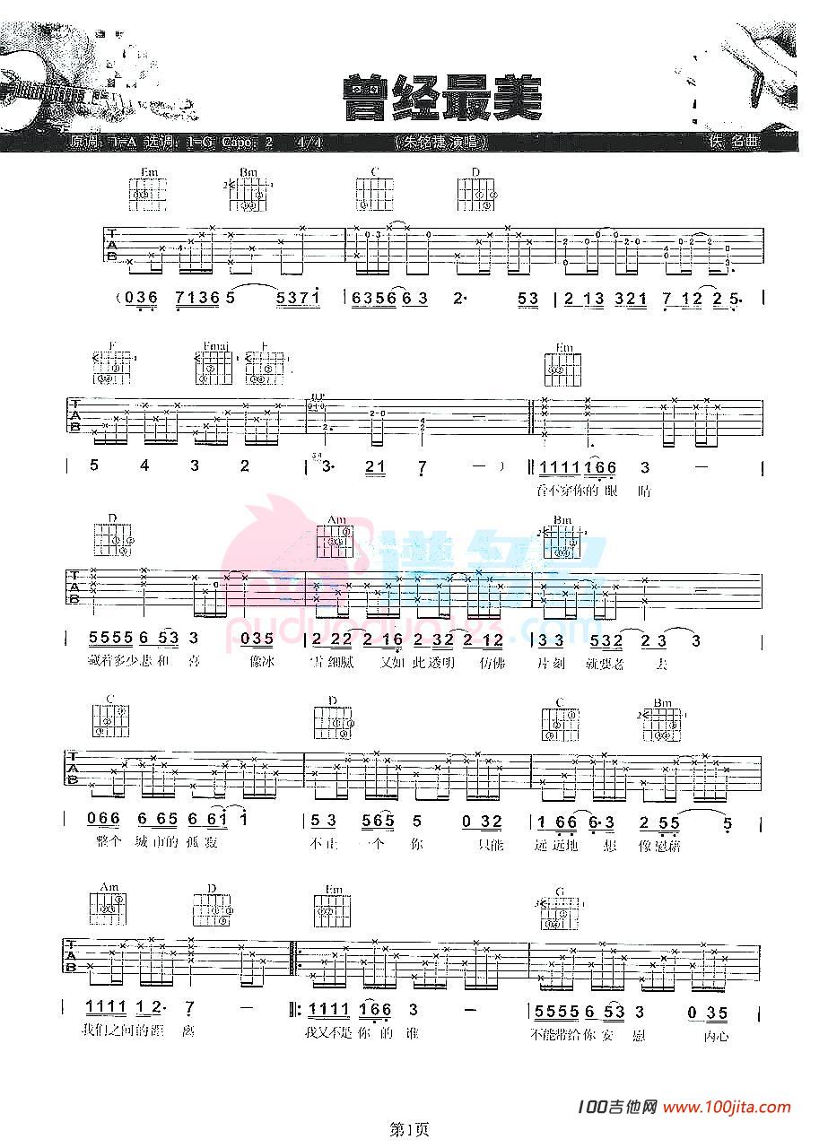 曲谱介绍: 《曾经最美》是朱铭捷演唱的一首歌曲,这首吉他谱选用G调指法编配。曾经的你是最美的,也是挥之不去的存在。不知道在时隔多年后现在的你是否还会记起那个曾经的自己。比较不错的歌曲。G调和弦编配指法简单容易弹唱。共三张高清图片六线谱。