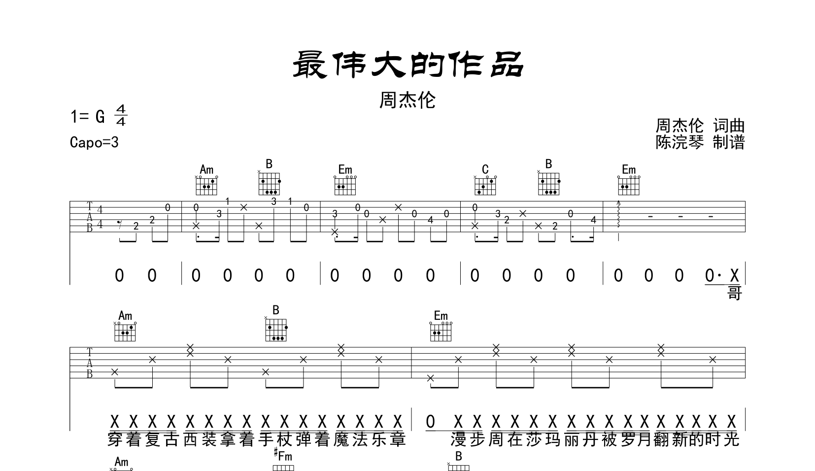曲谱介绍: 最伟大的作品吉他谱,周杰伦演唱的新歌,《最伟大的作品》吉他六线谱,共4张高清图片谱例,选用G调编配吉他谱,变调夹夹3品,原调bB调,弹唱难度初级较简单,本谱由@陈浣琴制谱分享。 《最伟大的作品》献给最忠实的杰迷,久违的歌曲,但来的刚好及时!