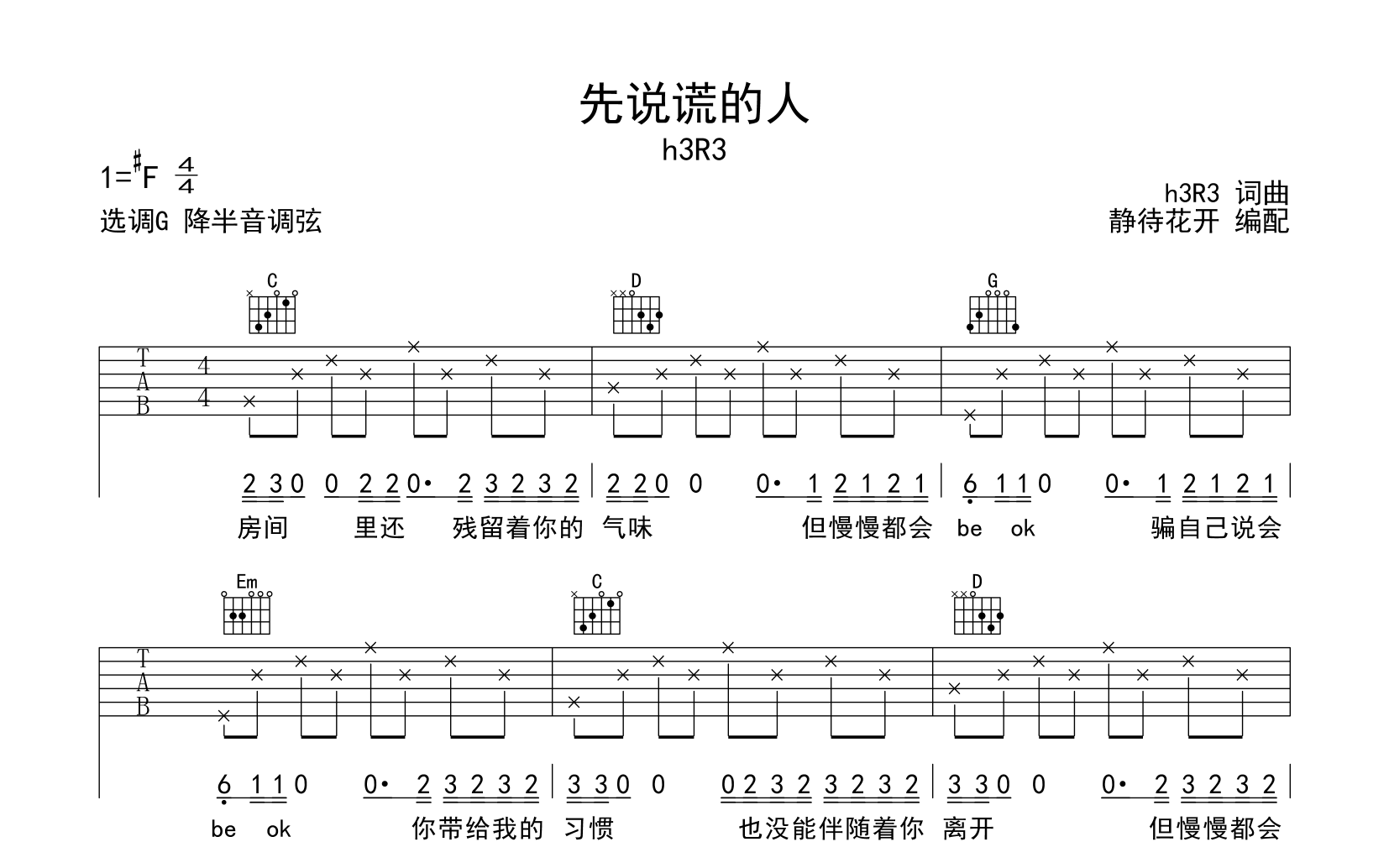 曲谱介绍: 先说谎的人吉他谱,H3R3演唱的一首流行快歌,《先说谎的人》吉他弹唱谱,本吉他谱采用G调和弦指法编配,演奏建议降半音调弦,原调#F调,也可以根据个人嗓音条件灵活选择变调夹位置,演奏的速度控制在每分钟80拍左右,演奏难度简单,本谱由@静待花开制谱,共3张高清图片谱。