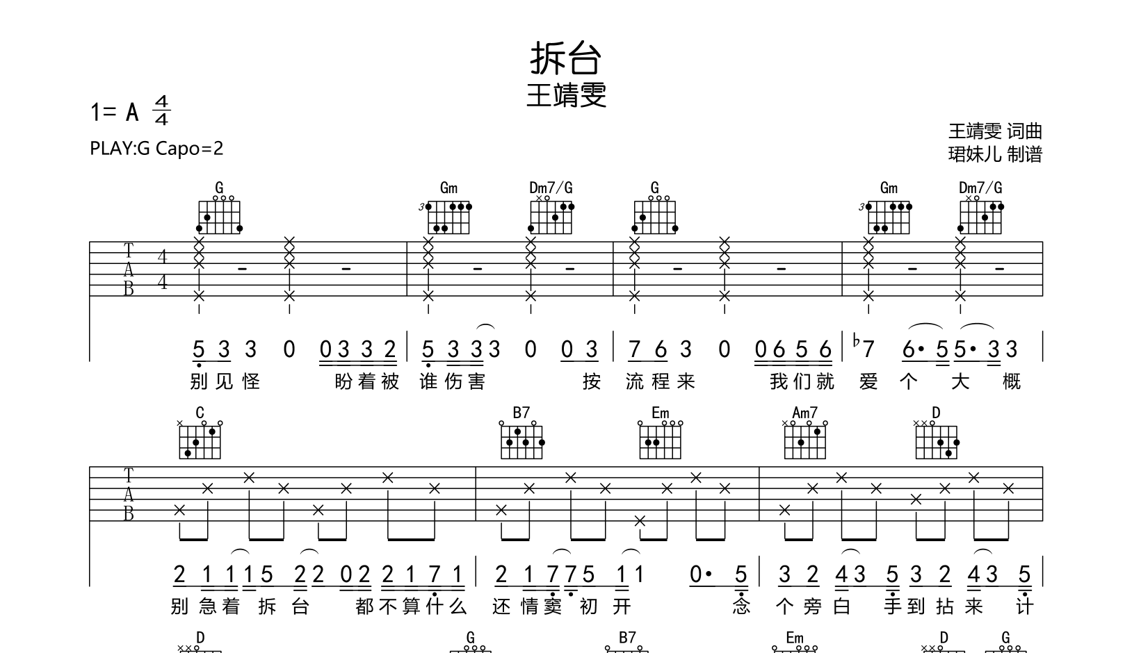 曲谱介绍: 拆台吉他谱,王靖雯演唱的一首歌曲,《拆台》吉他弹唱谱,本谱采用G调指法编配,弹唱建议变调夹2品,速度85BPM,节奏4/4拍,难度较简单,易上手,共三张高清图片谱,由@珺妹儿制谱分享。