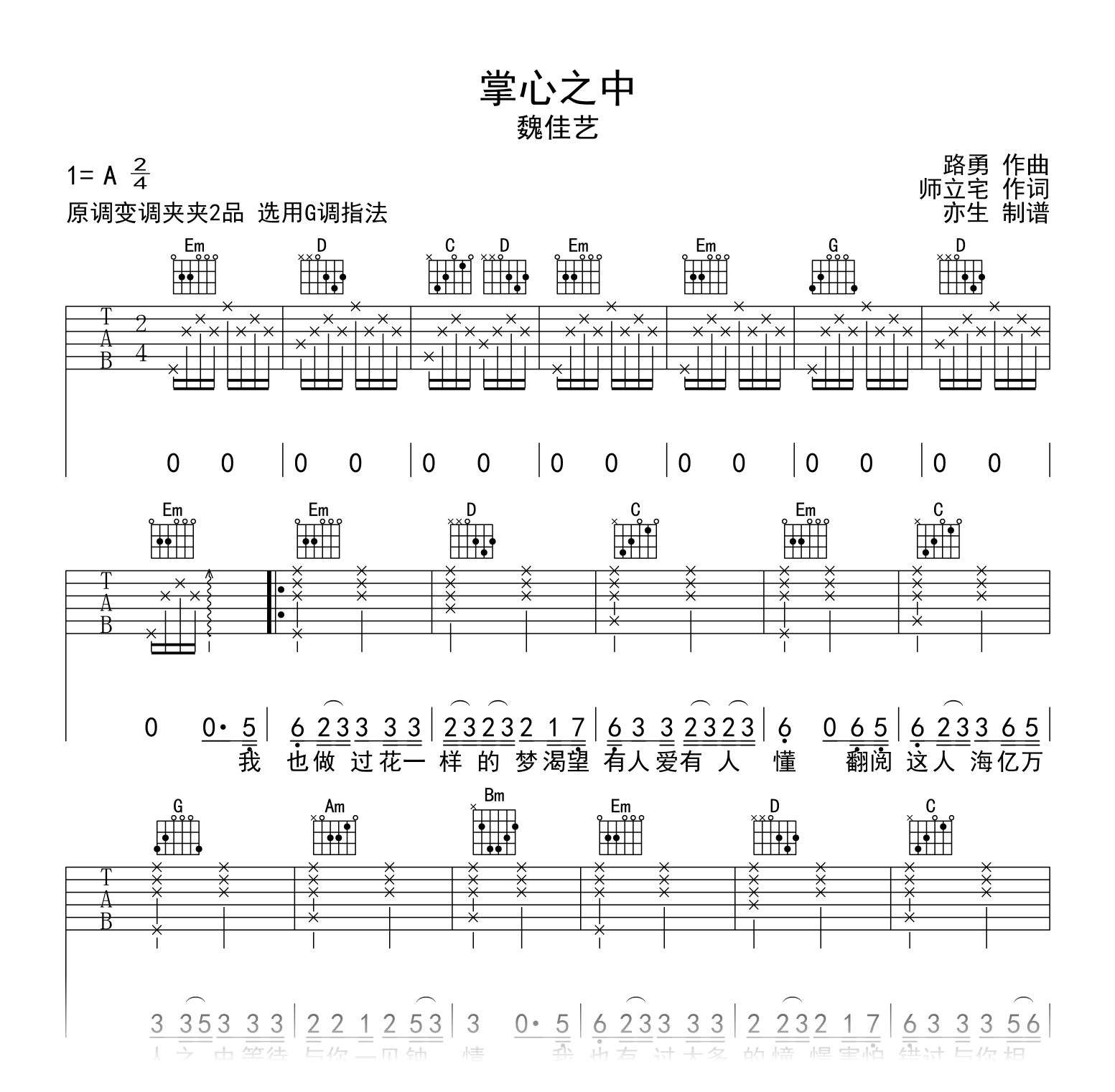 曲谱介绍: 掌心之中吉他谱,魏佳艺演唱的一首感人的网络歌曲,所有人最渴望的幸福,就是能被另一半呵护于掌心之中,愿我们都能拥有这一份不离不弃,柔情永恒的掌心之爱! 《掌心之中》吉他弹唱谱,原调A,选用G调和弦指法编配,节奏2/4拍,推荐变调夹夹第二品,每分钟95拍左右,演奏难度简单。
