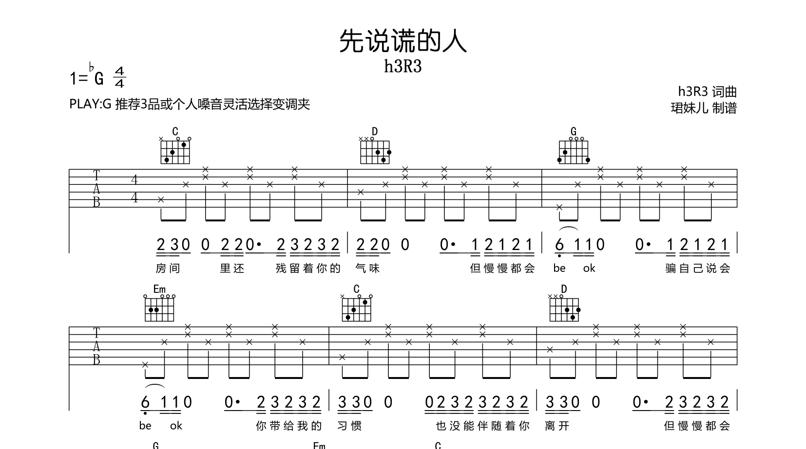 先说谎的人吉他谱 - H3R3 - G调吉他弹唱谱