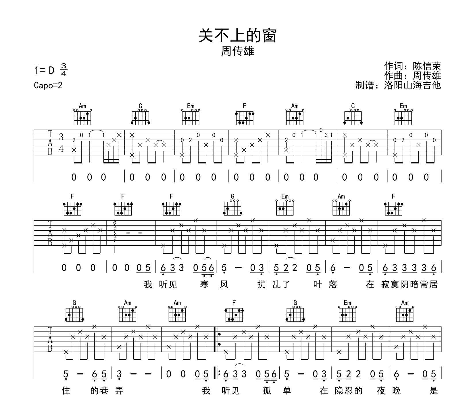曲谱介绍: 周传雄《关不上的窗》吉他谱,由洛阳山海吉他制谱分享,《关不上的窗》吉他弹唱谱,选用C调指法,原调D调,CAPO夹2品弹唱原调,本谱共有2张高清吉他六线谱图例。