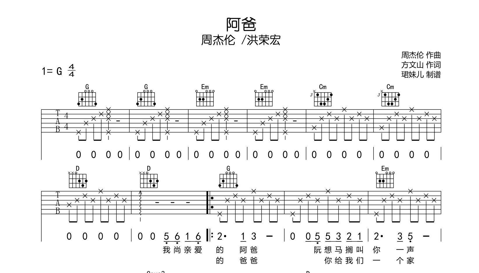 曲谱介绍: 阿爸吉他谱,周杰伦/洪荣宏演唱的一首歌曲,《阿爸》吉他弹唱谱,本谱采用G调指法编配,速度85BPM,节奏4/4拍,难度较简单,易上手,共三张高清六线谱图例,本谱由珺妹儿制谱上传。