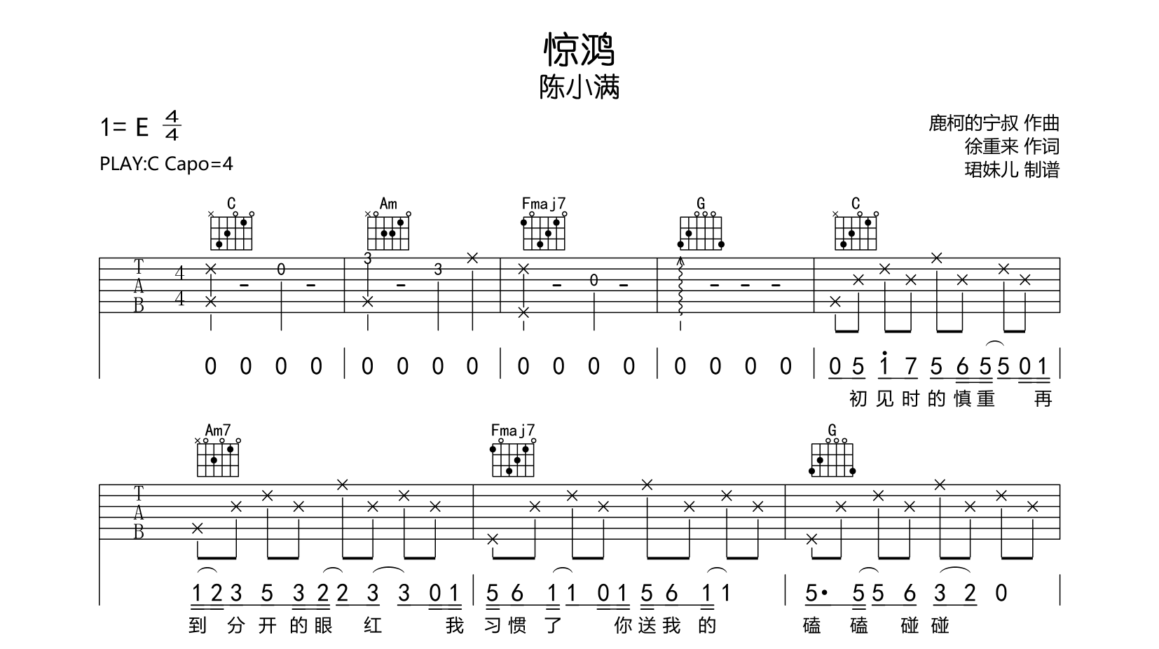 曲谱介绍: 惊鸿吉他谱,陈小满演唱的一首歌曲,《惊鸿》吉他弹唱谱,本谱采用C调指法编配,弹唱建议变调夹4品,速度85BPM,难度较简单,易上手,本谱由@珺妹儿制谱分享,共三张高清六线谱。