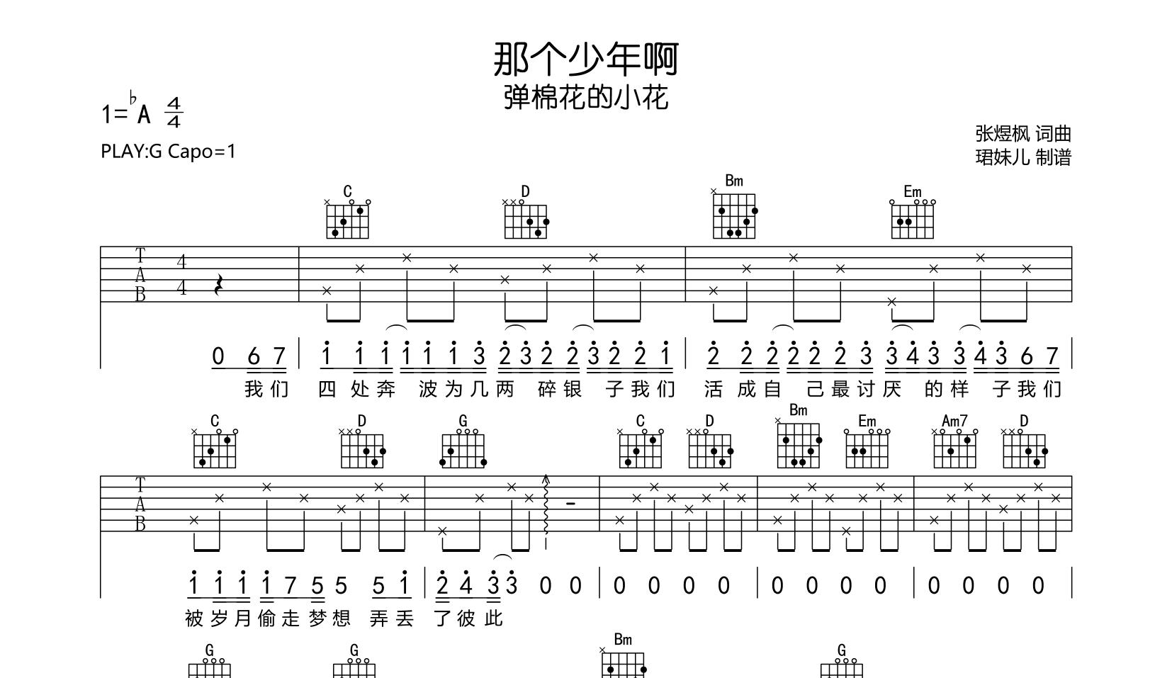 曲谱介绍: 那个少年啊吉他谱,弹棉花的小花演唱的一首歌曲,《那个少年啊》吉他弹唱谱,本谱采用G调指法编配,弹唱建议变调夹1品,速度85BPM,节奏4/4拍,难度较简单,易上手,共3张高清六线谱图例,由珺妹儿制谱。