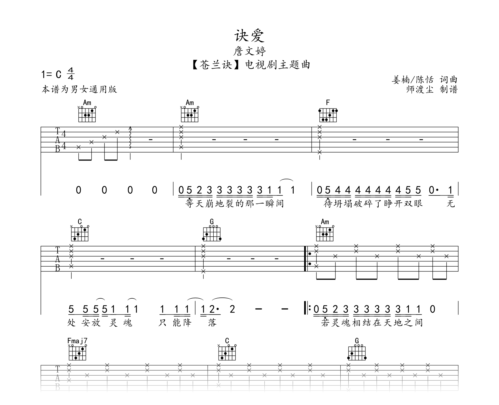 曲谱介绍: 诀爱吉他谱,詹雯婷演唱,《苍兰诀》电视剧主题曲,燃爱的旋律,开阔的唱腔、极富张力弹性的演绎方式,赋予荡气回肠的独特魅力。 《诀爱》吉他弹唱谱,编配扒谱采用C调和弦指法编配,男女通用版本,也可以根据个人嗓音条件灵活选择变调夹位置,速度控制在80拍左右,两张图片谱例。