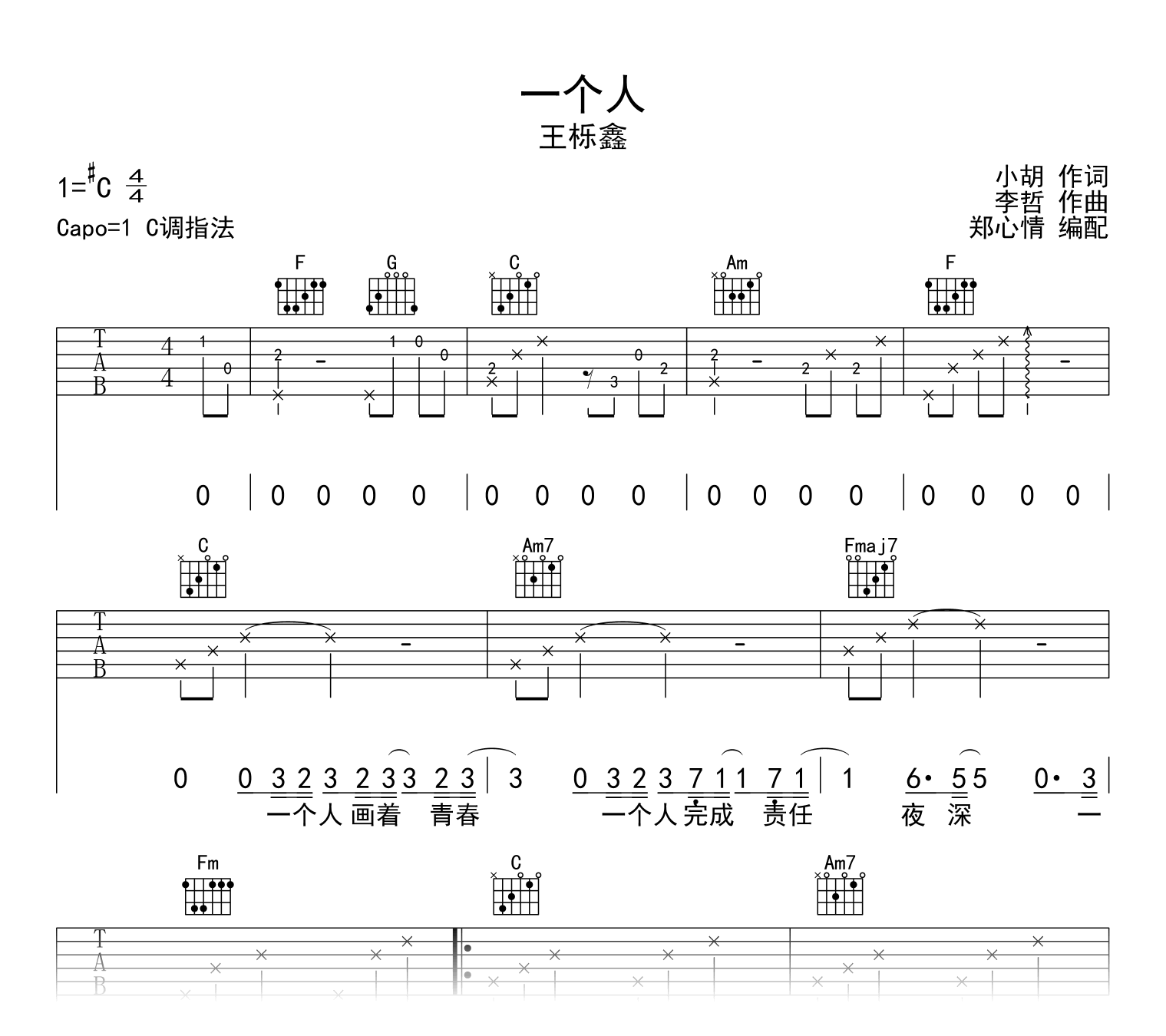 曲谱介绍: 一个人吉他谱,王栎鑫演唱,轻柔旋律真挚的歌词,娓娓唱出忙碌都市中一个人的生活态度。《一个人》吉他弹唱谱,选用C调指法编配,原调为#C调,变调夹夹一品。