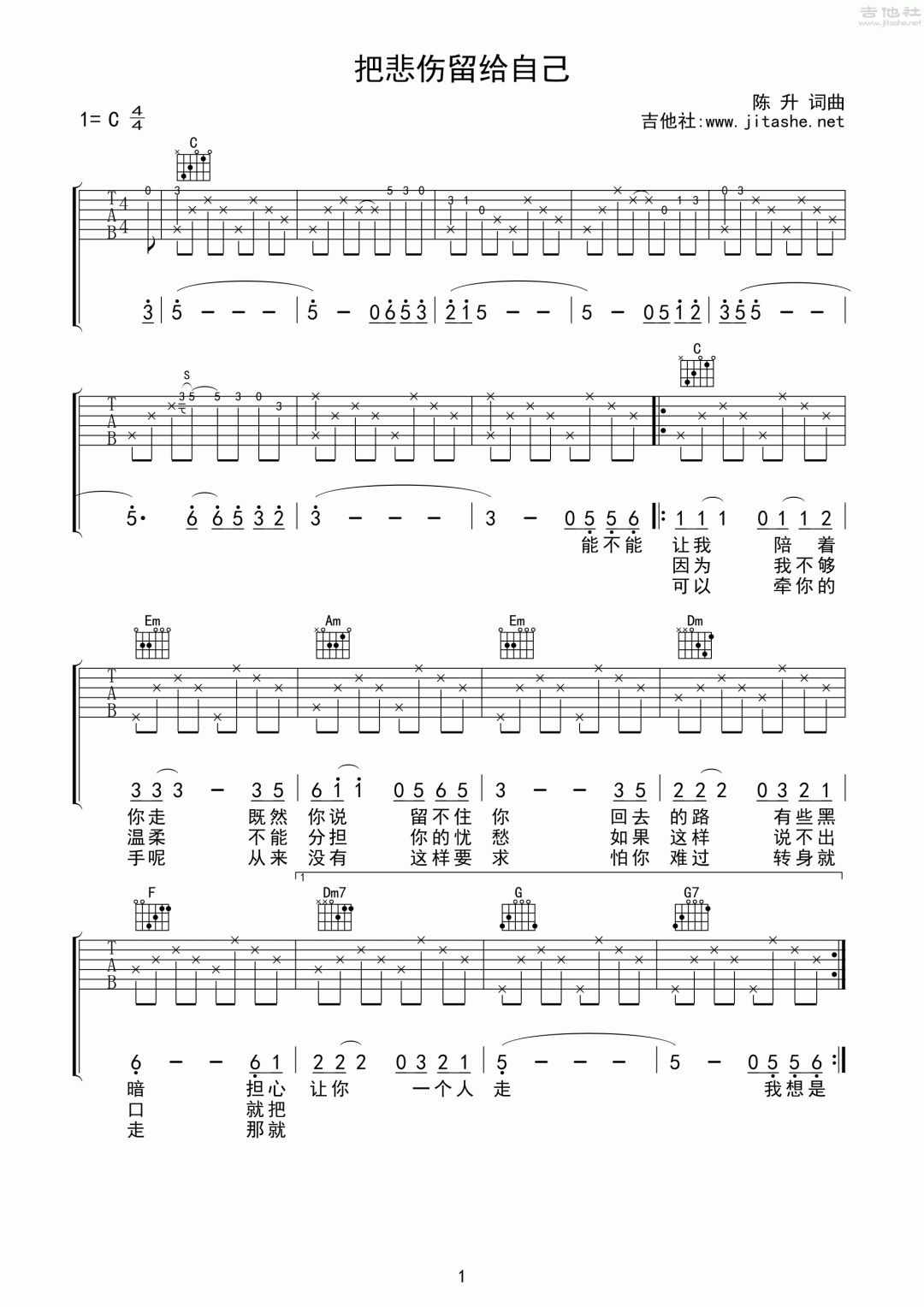 把悲伤留给自己吉他谱 - 弹唱 - C调吉他弹唱谱