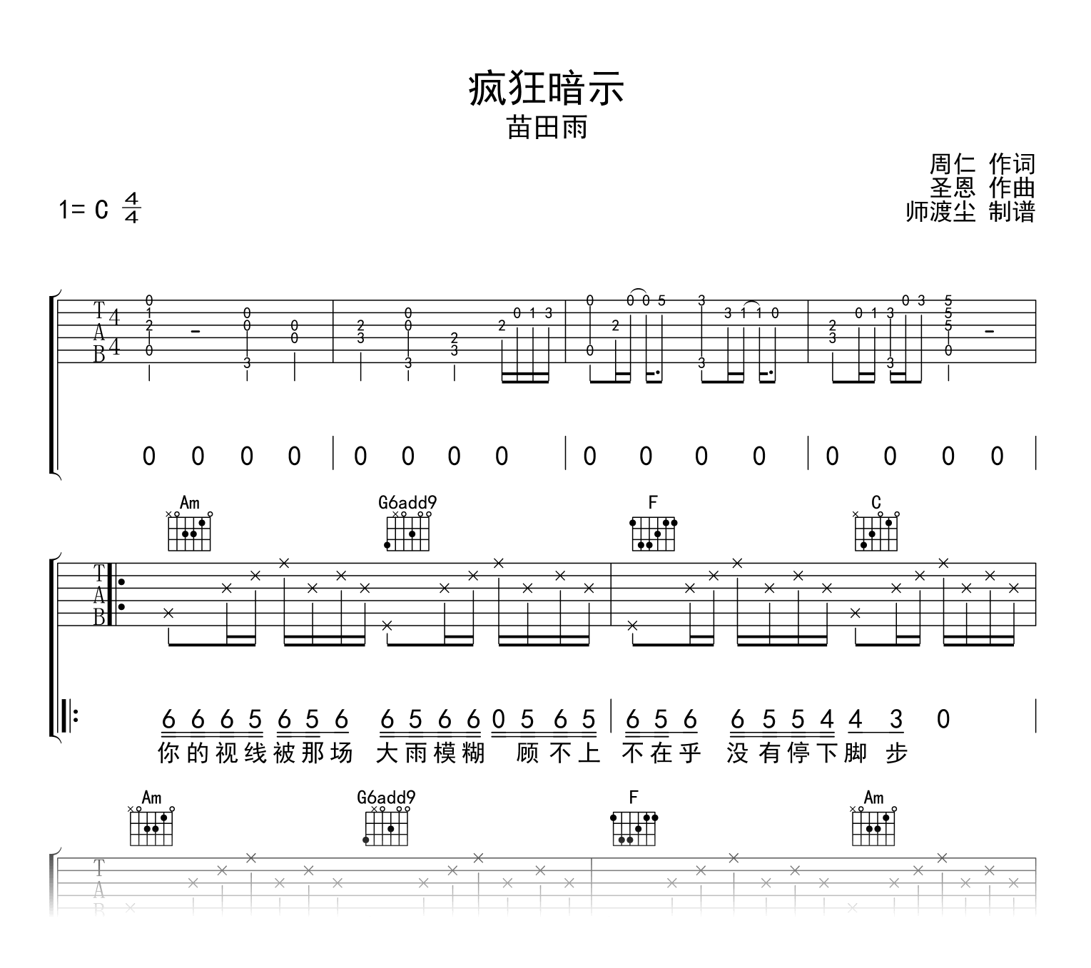 疯狂暗示吉他谱 - 苗田雨 - C调吉他弹唱谱