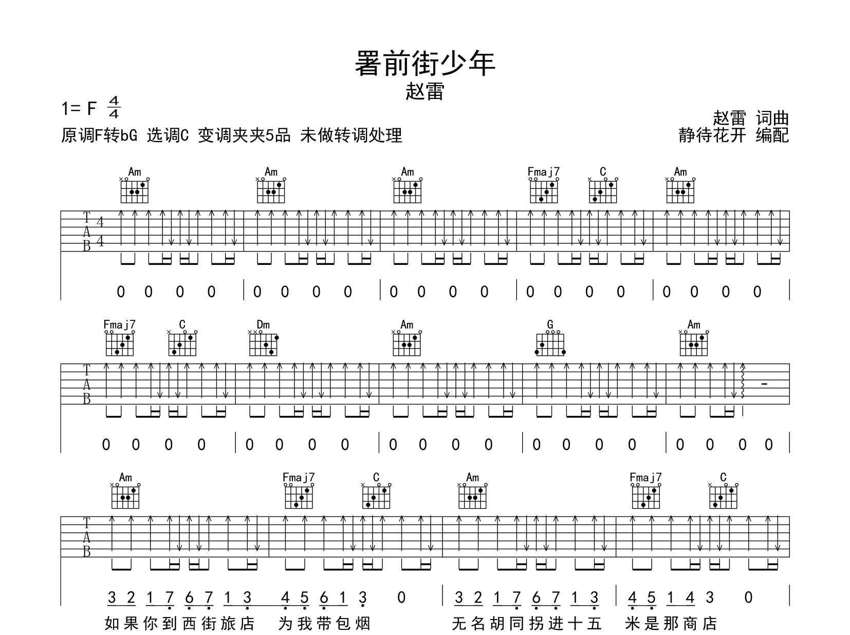 曲谱介绍: 《署前街少年》吉他谱,赵雷演唱,《署前街少年》吉他弹唱谱,来自@静待花开编配扒谱制作,本吉他谱采用C调和弦指法编配,推荐变调夹夹第5品演奏,原调F转bG调,为降低难度,未做转调处理,也可以根据个人嗓音条件灵活选择变调夹位置,演奏的速度控制在每分钟75拍左右,演奏难度简单,共3张高清图片谱例。
